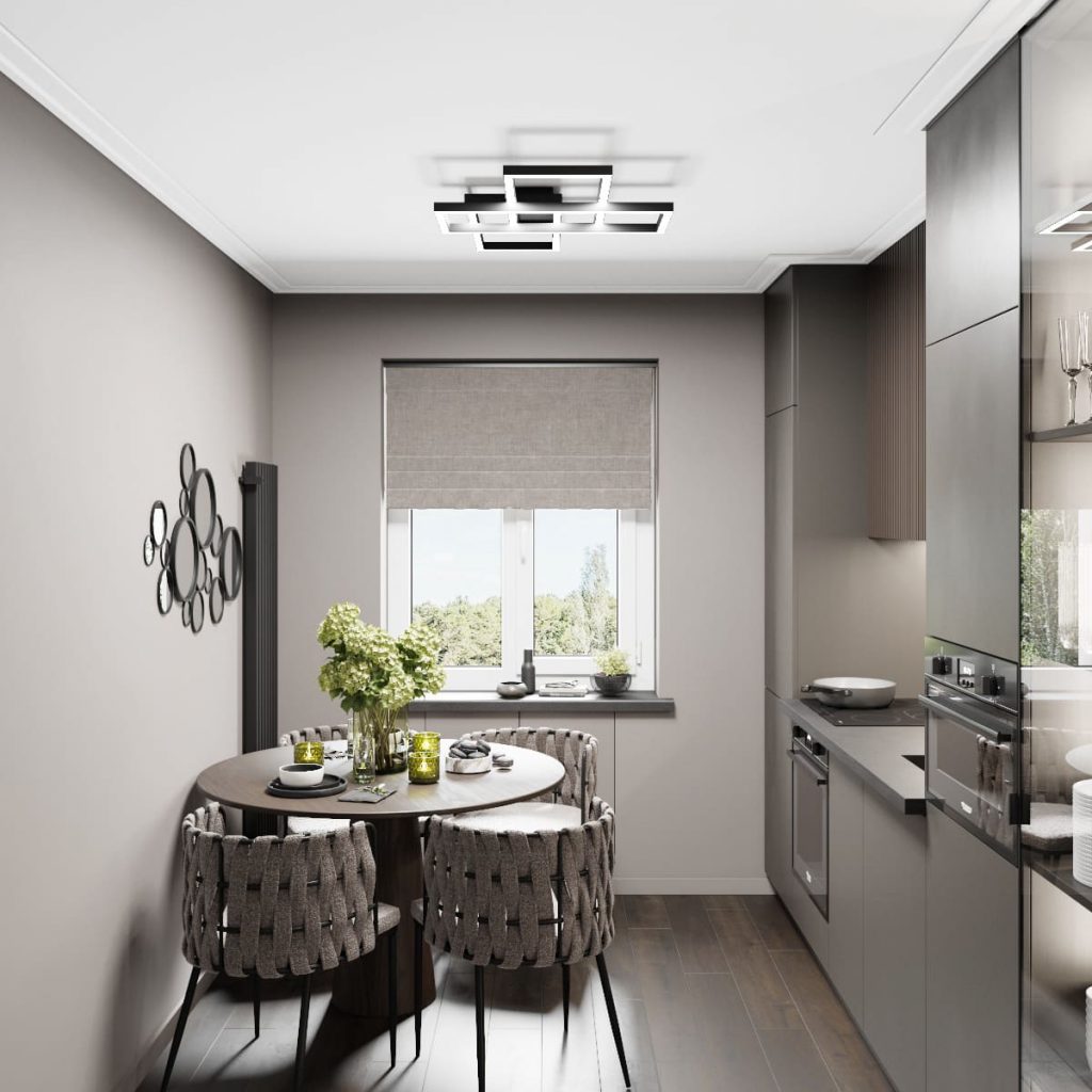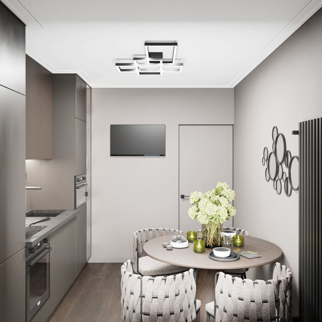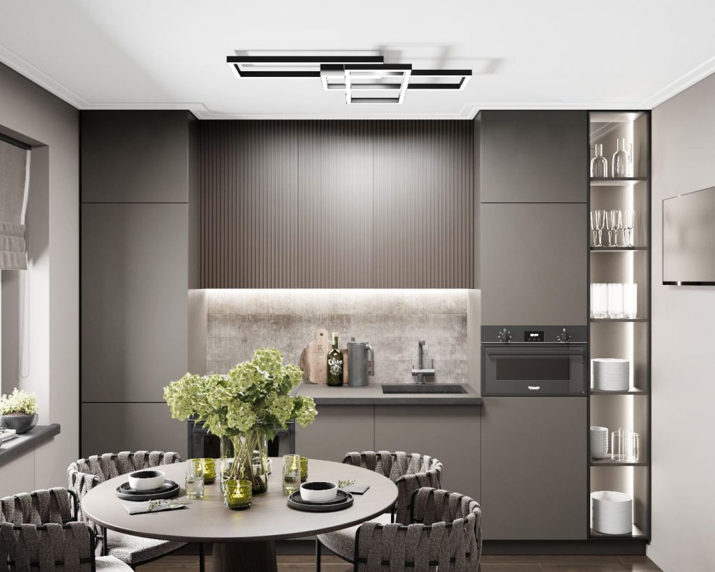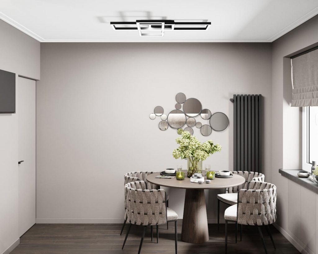 Кухню не переделывали кардинально — работали в рамках существующей планировки и разводки, делая упор на обновление и удобство. Гладкие фасады в графитовом тоне без ручек, встроенная техника, ниша с подсветкой — всё выстроено для комфорта и визуальной чистоты. Обеденная зона получилась особенно тёплой: круглый стол с текстурой дерева и мягкие кресла с плетёной обивкой добавляют уюта. Панно из зеркал и геометричный светильник стали акцентами — сдержанными, но запоминающимися.