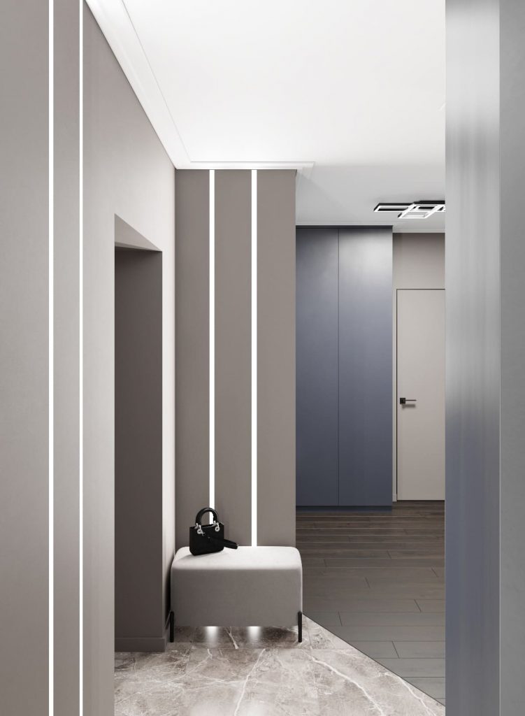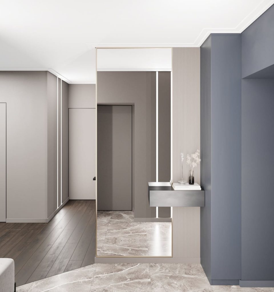 Небольшой холл с зеркалом и консолью стал удобной зоной для последних штрихов перед выходом. А встроенные вертикальные линии подсветки и отделка с рельефом добавили ритм и динамику — без лишнего декора.