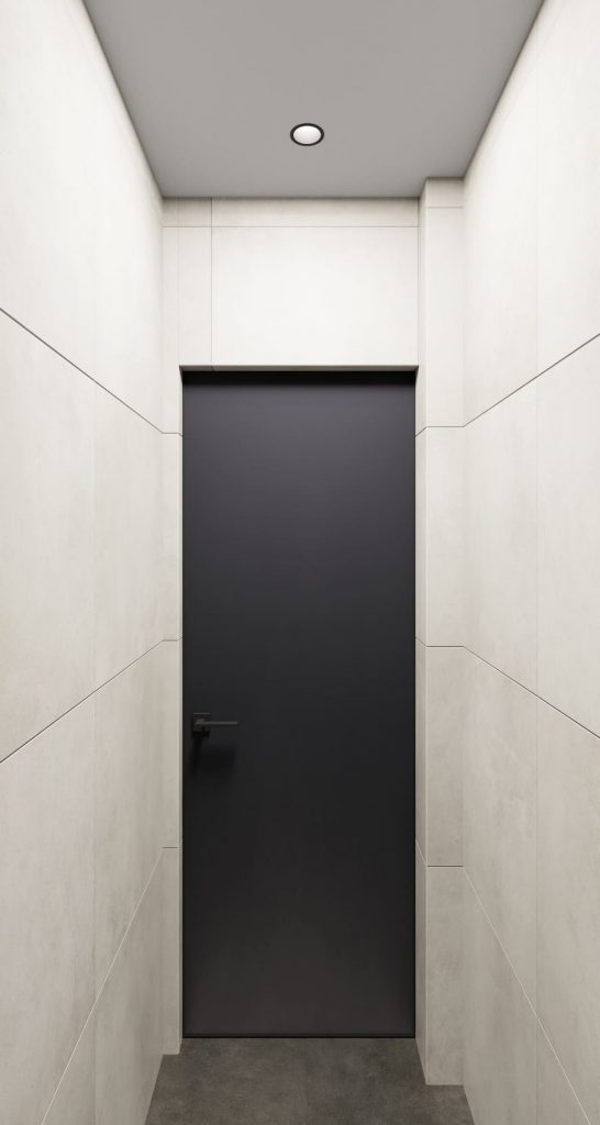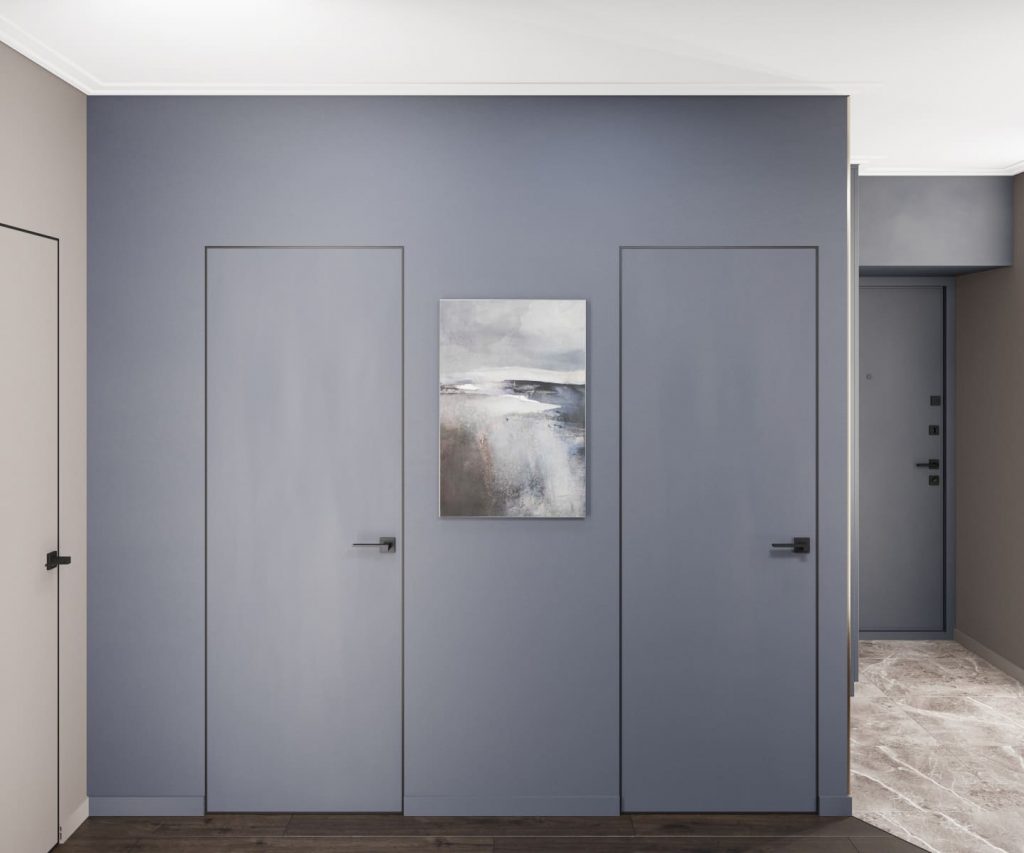 Прихожая получилась сдержанной и очень чистой визуально. Мы выбрали серо-голубую палитру — по настроению заказчиков, которые хотели, чтобы с первых шагов в квартире чувствовалась ясность, порядок и лёгкость. Стены выкрашены в матовый глубокий серо-синий оттенок, а двери сделаны вровень со стеной — скрытые, с чёткими чёрными ручками.