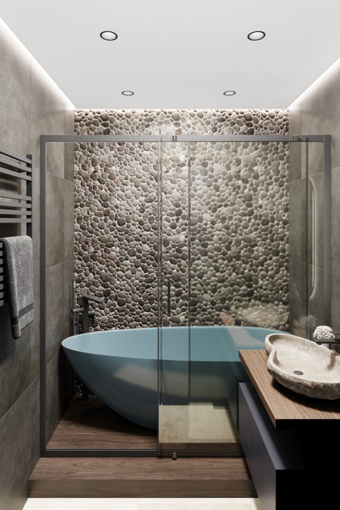 Заказчики настояли на отдельно стоящей ванне на подиуме — решение зрелищное, поэтому мы постарались вписать её максимально аккуратно, выделив зону стеклянной перегородкой и оформив стену за ванной декоративной мозаикой под гальку.