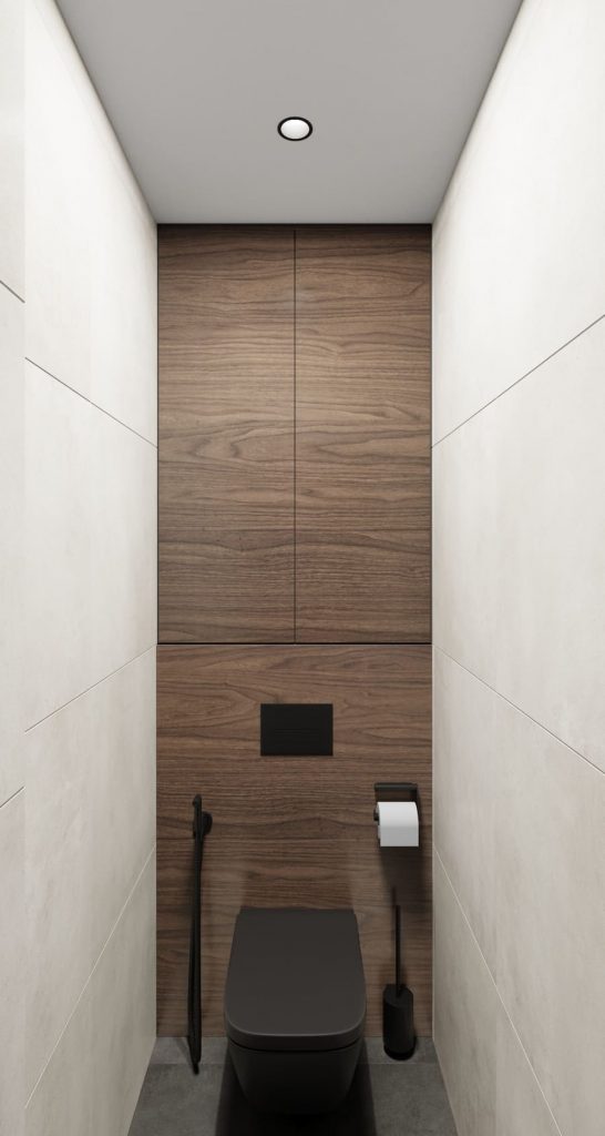 В оформлении санузла сделали ставку на минимализм и тактильные материалы. Светлые матовые стены сочетаются с тёмным керамогранитом на полу и контрастной отделкой инсталляции под дерево — за которой скрыт встроенный шкаф для хранения. Черная сантехника и фурнитура подчёркивают графичность пространства: унитаз, смыв, гигиенический душ и ручка двери — всё выдержано в едином стиле. Освещение точечное, ровное, без лишнего акцента.