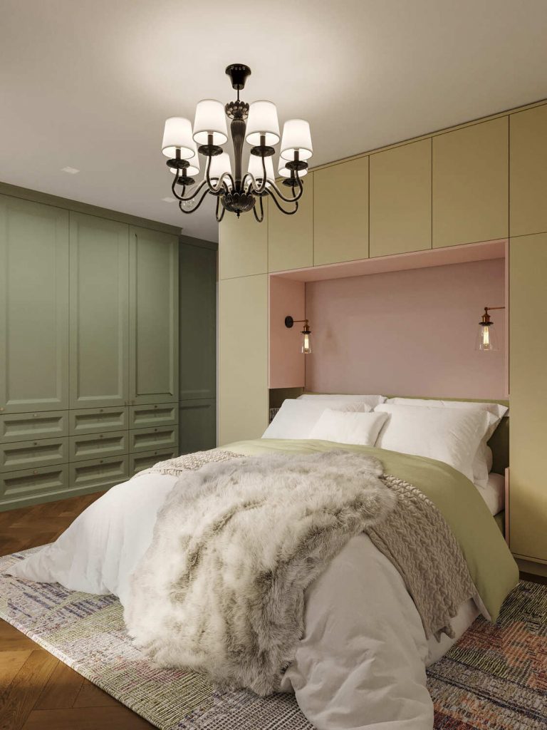 Одним из главных запросов заказчиков было большое количество мест для хранения. Эта задача решена с помощью системы встроенных шкафов: один гардеробный блок выполнен в нежно-оливковом цвете, а второй, встроенный вокруг кровати, выполнен в теплых бежевых тонах. Такое решение позволяет визуально разгрузить пространство, сохраняя его легкость.