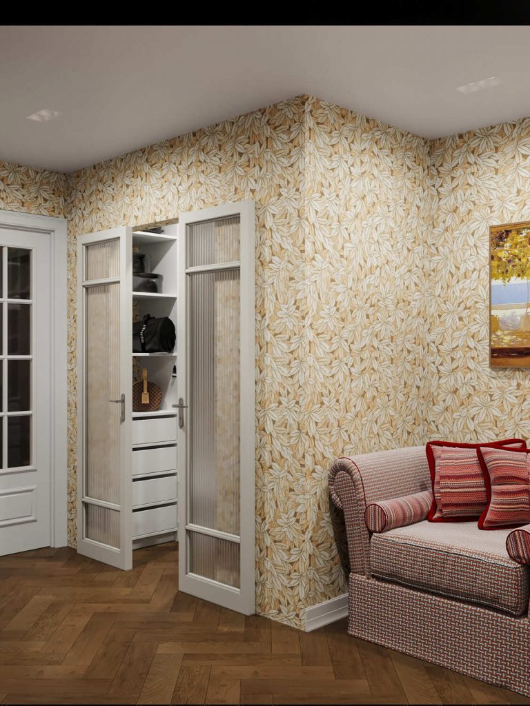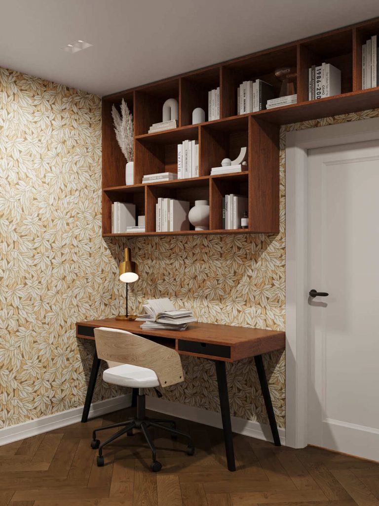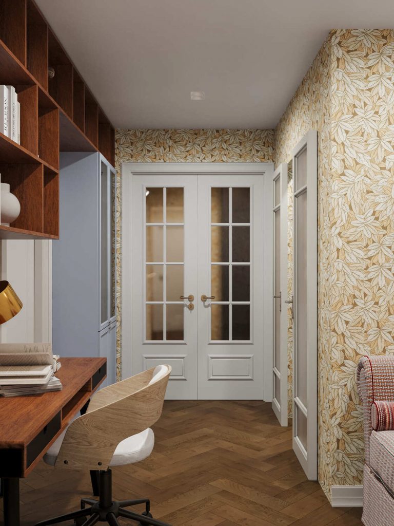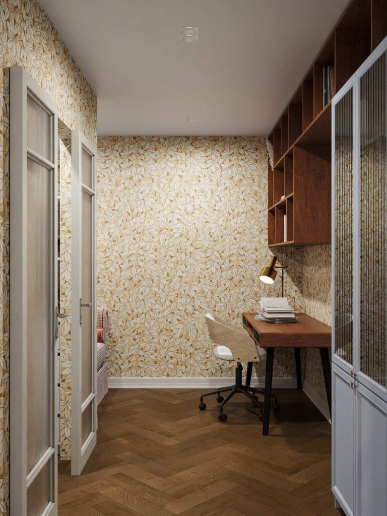 Обои с теплым растительным узором придают пространству живость и уют, поддерживая общую концепцию квартиры. Дверцы встроенного гардероба выполнены со стеклянными вставками, что делает хранение удобным и визуально легким. Картина в классическом стиле, мягкое освещение и текстильные акценты завершают образ, придавая кабинету обжитой, теплой атмосферы.