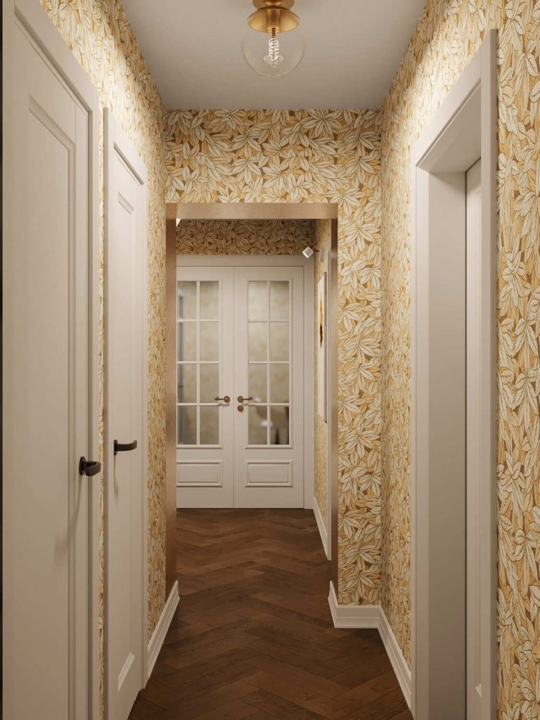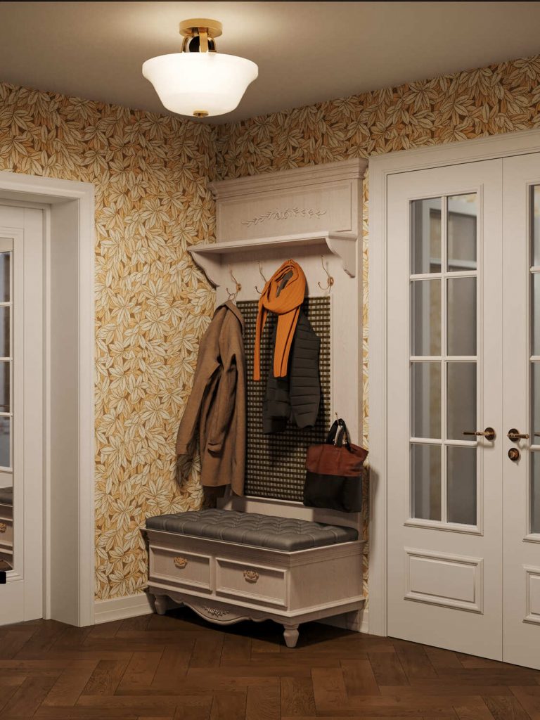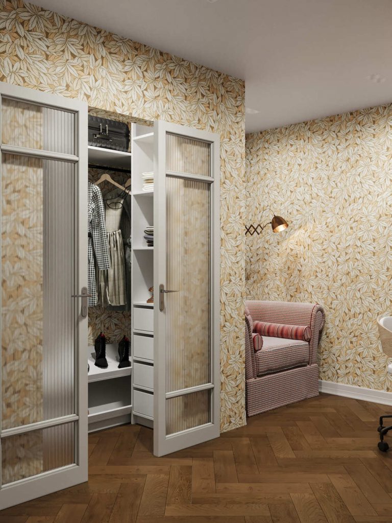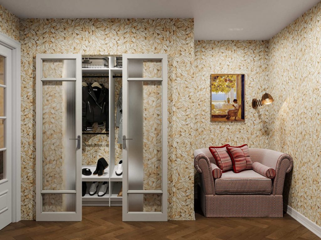 Обои с теплым растительным узором придают пространству живость и уют, поддерживая общую концепцию квартиры. Дверцы встроенного гардероба выполнены со стеклянными вставками, что делает хранение удобным и визуально легким. Картина в классическом стиле, мягкое освещение и текстильные акценты завершают образ, придавая кабинету обжитой, теплой атмосферы.