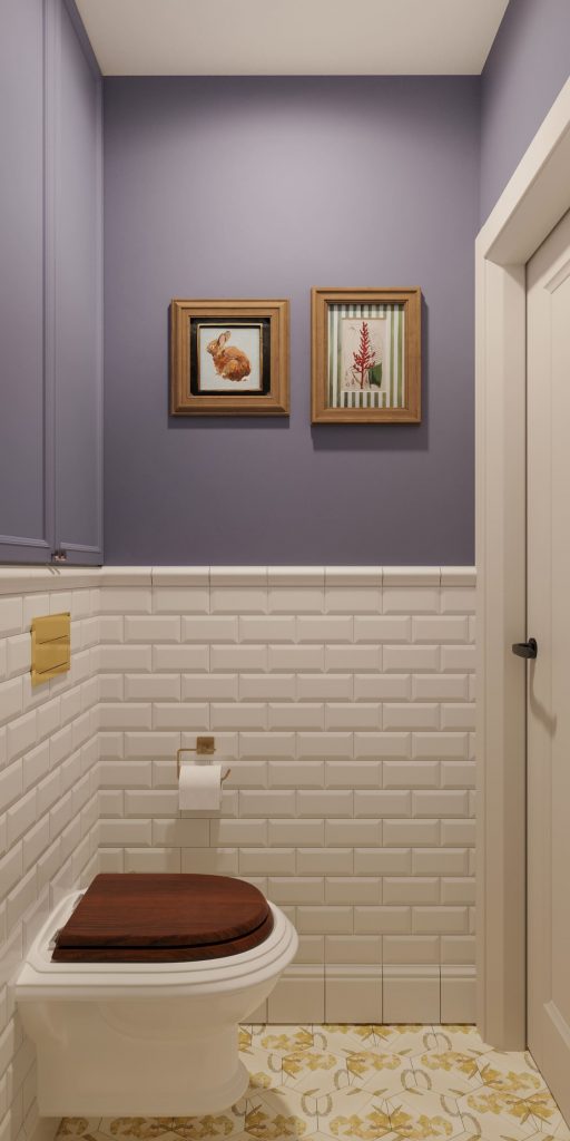 Оформление стен в санузле выполнено в двухуровневой отделке: нижняя часть — классическая белая плитка «кабанчик», придающая интерьеру лёгкость и чистоту, а верхняя часть — глубокий лавандово-серый оттенок краски, который добавляет пространству спокойствия и уюта. Это цветовое решение делает интерьер свежим, но при этом уютным.