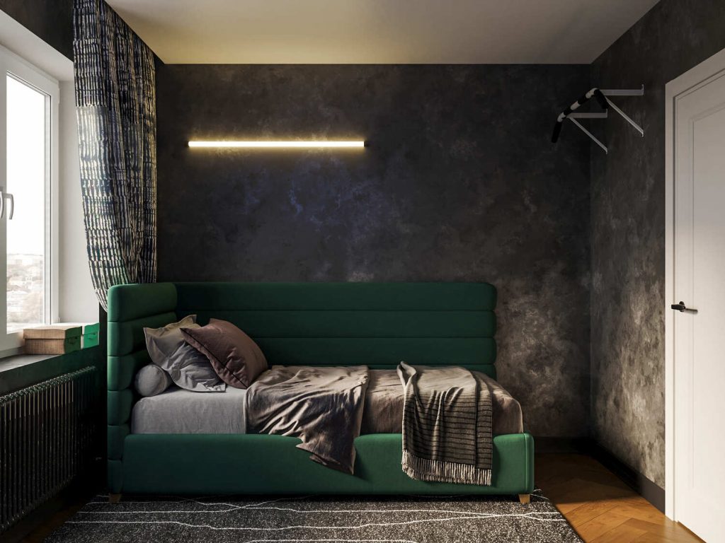 Основа интерьера — сочетание графитовых стен с выразительной текстурой и темных деревянных поверхностей. Это придает комнате основательность и характер. Яркие акценты, такие как изумрудное изголовье кровати и синий элемент в рабочей зоне, добавляют динамики и создают баланс между строгостью и уютом.