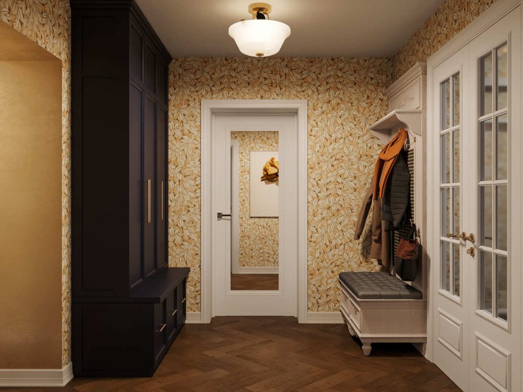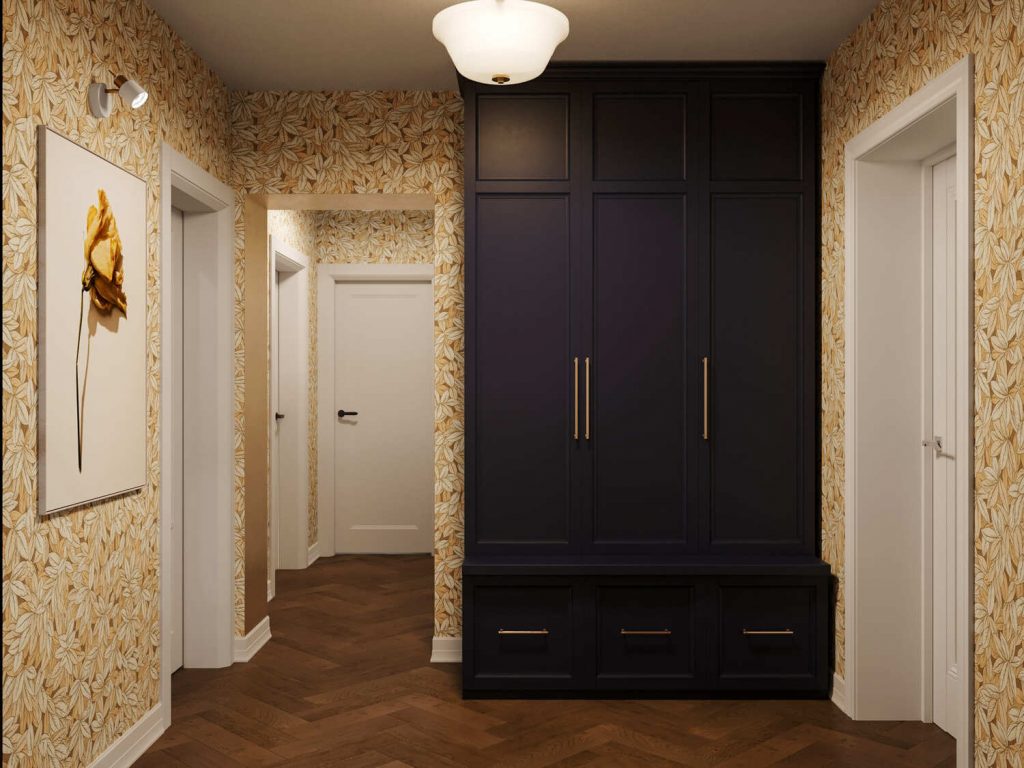Возле входа в прихожую разместился оригинальный шкаф для верхней одежды, выполненный в глубоких темных тонах с золотистыми ручками. Его продуманная конструкция включает вместительные ящики в нижней части, удобные для хранения обуви и аксессуаров. Такой контрастный акцент добавляет интерьеру изысканности и зрительно уравновешивает теплые оттенки стен.
