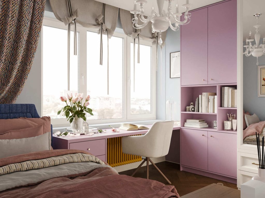 Рабочее место у окна продумано до мелочей: просторный розовый письменный стол, удобное кресло, шкафчики и полки для хранения книг и учебных принадлежностей. Такое расположение обеспечивает хорошее естественное освещение и комфорт для учебы.