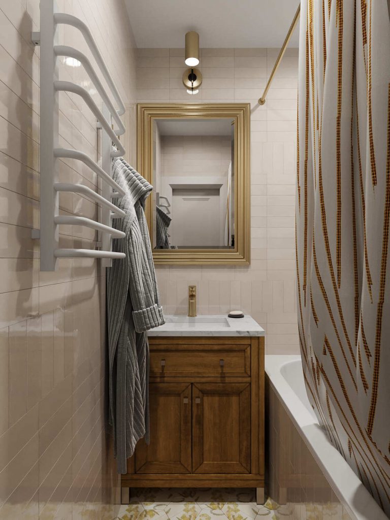 Интерьер ванной комнаты выполнен в светлых песочно-бежевых оттенках, что делает пространство визуально более просторным и светлым. Керамогранит с мягкой текстурой добавляет интерьеру тепла, а золотистые акценты в сантехнике и деталях придают изысканность.