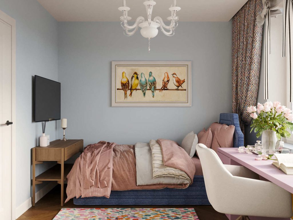 Основу оформления составляют мягкие, пастельные тона: небесно-голубые стены, нежно-розовые и бежевые акценты в текстиле, а также спокойный белый цвет в мебели. Такое сочетание делает пространство воздушным и уютным. Яркие детали, такие как коврик с разноцветным узором и картина с птицами, добавляют интерьеру живости и настроения.
