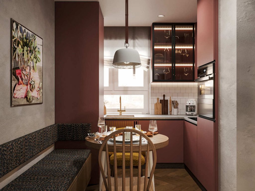Кухня в этом интерьере — это не просто место для готовки, а настоящее сердце дома, где семья собирается за уютными ужинами и неспешными утренними завтраками. Пространство выполнено в теплых и глубоких оттенках, создавая ощущение комфорта и уюта, а продуманная планировка делает кухню максимально функциональной даже при компактных размерах.