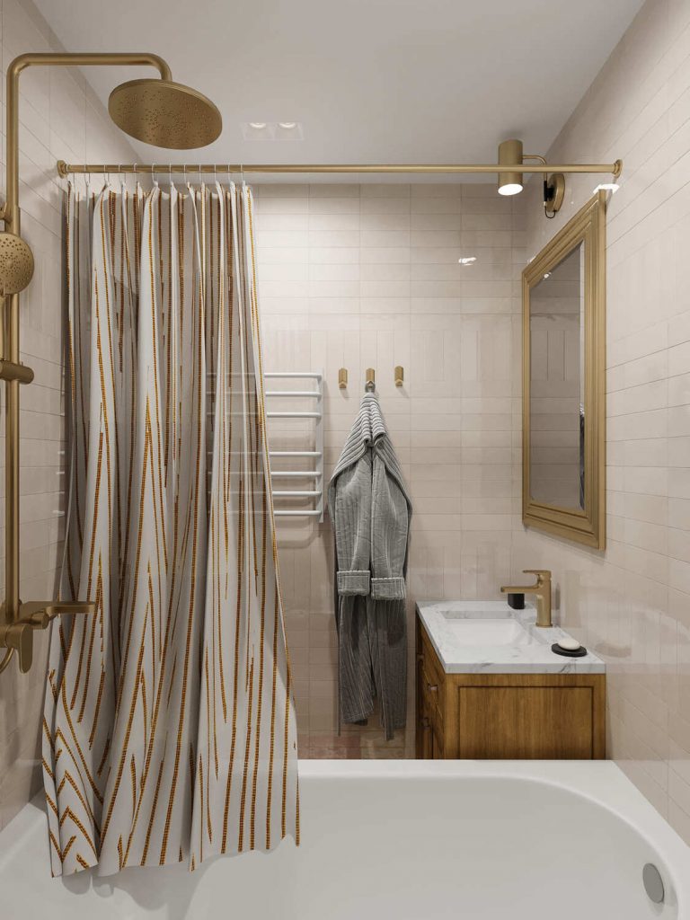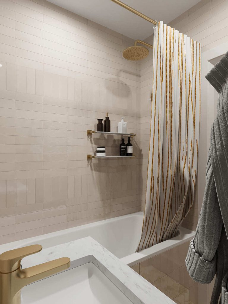 Душевая зона оформлена сдержанно, но эффектно: душевая система с тропическим душем в золотом оттенке, стеклянная полка для косметики и стильная штора с геометрическим рисунком.