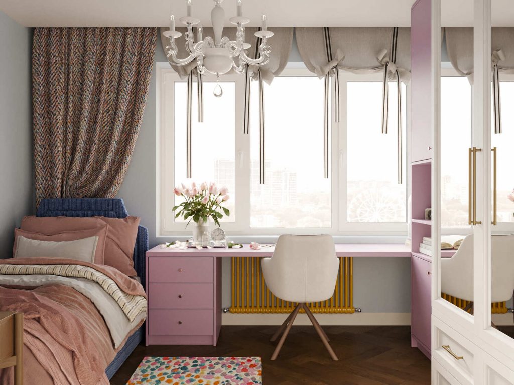 Комната дочери — это гармоничное сочетание нежных оттенков, легкости и функциональности. Интерьер подчеркивает индивидуальность подростка, создавая атмосферу, в которой можно отдыхать, учиться и мечтать.