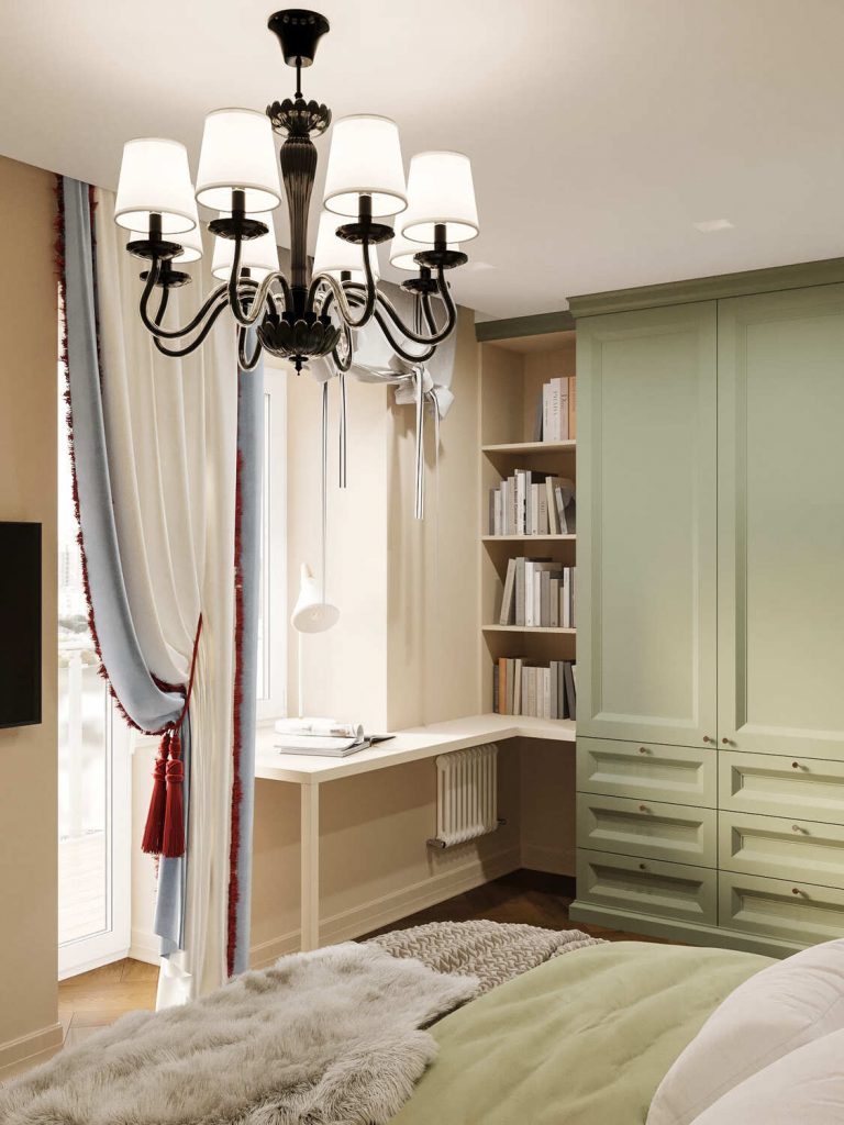 В спальне также предусмотрено небольшое рабочее место. Лаконичный белый стол, стеллажи для книг и удобное кресло создают идеальные условия для работы или чтения. Оформление окна — классическое, с красивыми драпировками в голубых и бежевых тонах с бордовыми акцентами, которые добавляют пространству изысканности.
