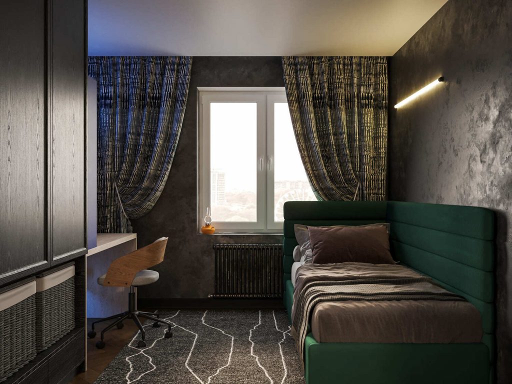 Комната старшего сына выполнена в темных, глубоких оттенках, создающих стильное и мужественное пространство.