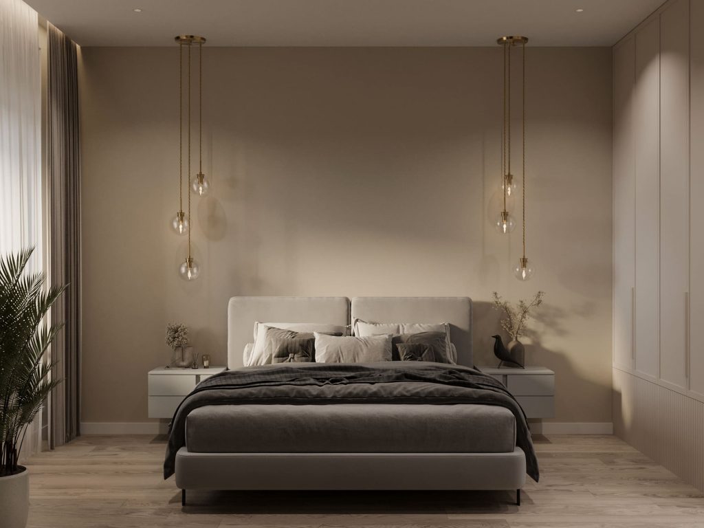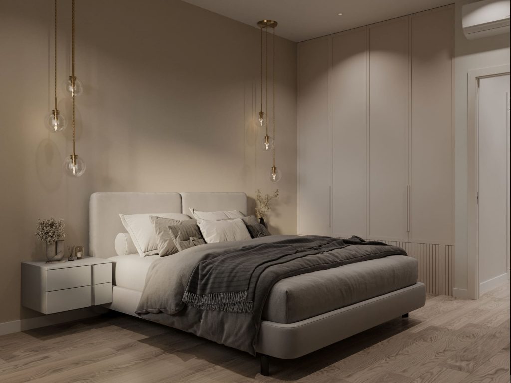 Понимая, что после насыщенных дней в городе заказчикам необходимо место для полноценного отдыха, мы создали уютную спальню с гардеробной и функциональной лоджией. Большая кровать с мягким изголовьем и текстильными элементами обеспечивает комфорт и уют. Боковые подвесные светильники с золотыми акцентами добавляют элегантности и создают приятное освещение для чтения перед сном.