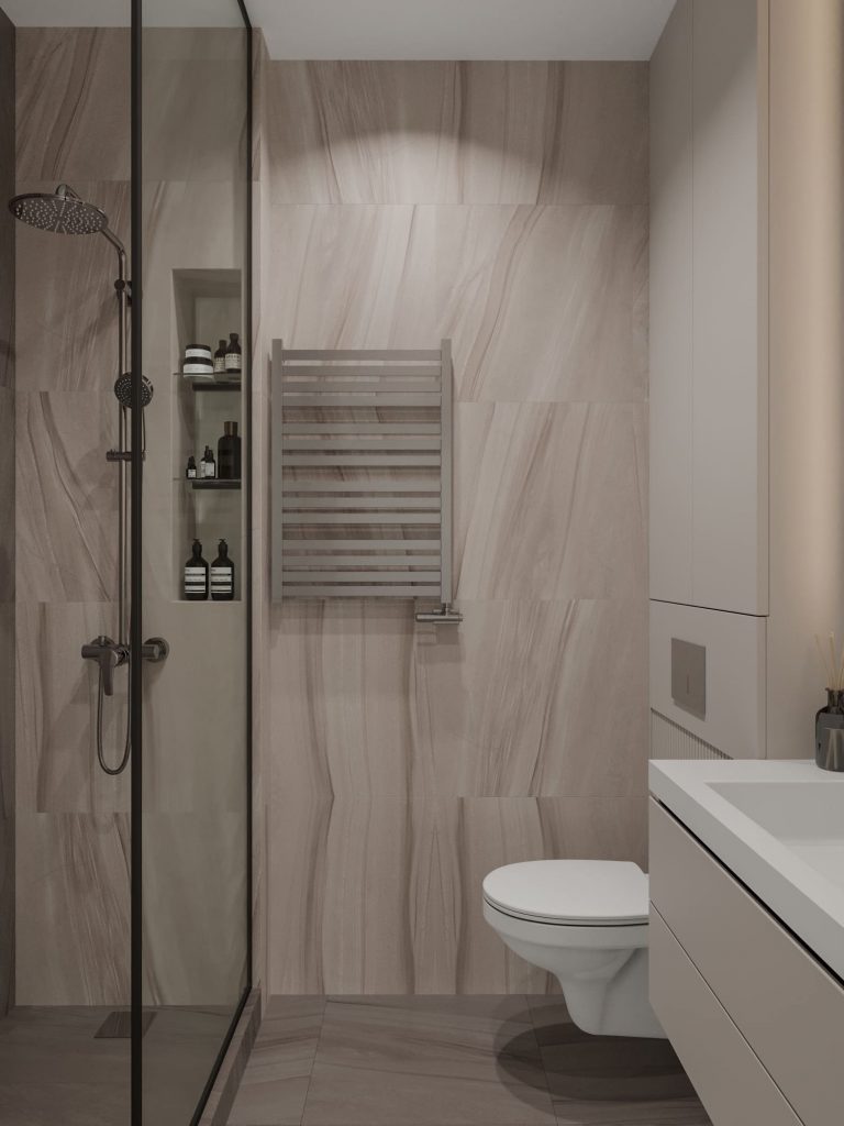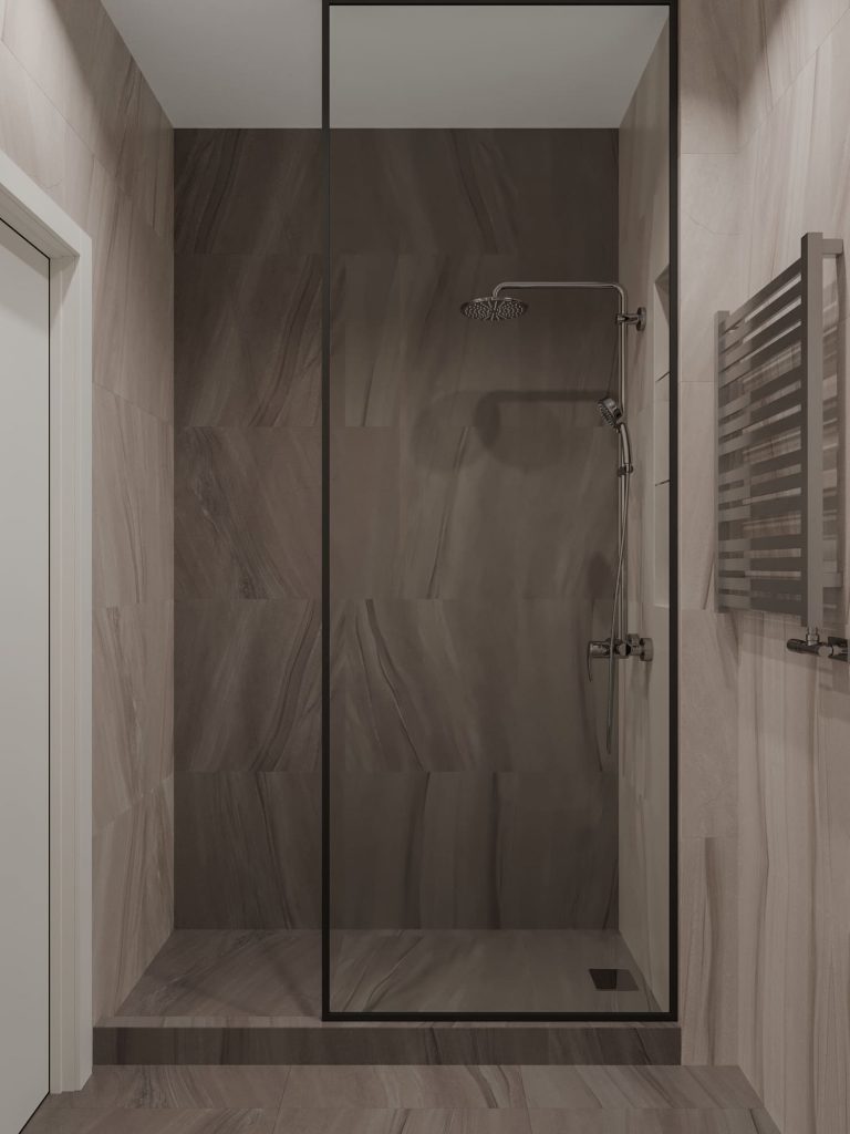 Как нам сообщила супруга — они хотят иметь просторный санузел с большой душевой. мы разработали современное и функциональное пространство, где можно не только освежиться, но и расслабиться после долгого дня. Подвесной унитаз с инсталляцией облегчает уборку и придаёт интерьеру визуальную лёгкость. Стены и пол облицованы плиткой с мраморной текстурой, создавая ощущение роскоши и элегантности, при этом материалы устойчивы к влаге и легко чистятся.