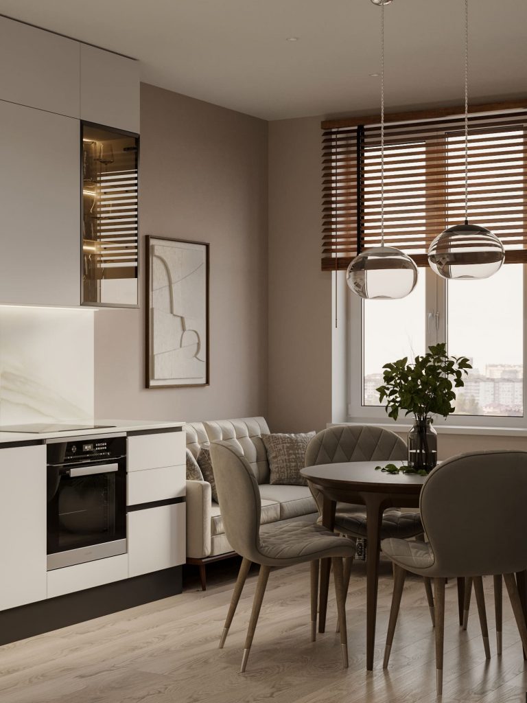 Обеденная зона с круглым столом и мягкими стульями создает уютное пространство для длительных бесед. Подвесные светильники над столом обеспечивают мягкое освещение, а также добавляют стильный акцент. В зоне отдыха команда Domeo разместила компактный диван в светлой грязе-влагостойкой обивке, дополнив интерьер картинами и текстилем в серо-бежевых тонах. Дизайнеры Domeo постарались сделать эту зону максимально гостеприимной, чтобы каждый визит превращался в маленький праздник.