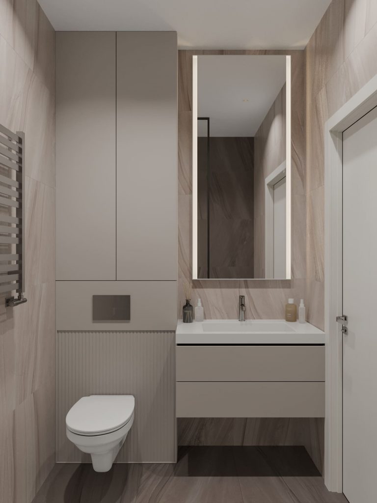 Душевая зона с прозрачной перегородкой и матовой чёрной фурнитурой добавляет стильный контраст и современный акцент. Встроенная ниша в стене позволяет удобно хранить все необходимые средства, сохраняя минимализм пространства. Подвесная тумба с интегрированной раковиной и скрытыми системами хранения оставляет пол свободным, упрощая уборку. Зеркало с LED-подсветкой по периметру обеспечивает мягкий свет и визуально расширяет пространство, превращая утренние и вечерние ритуалы в особое удовольствие.