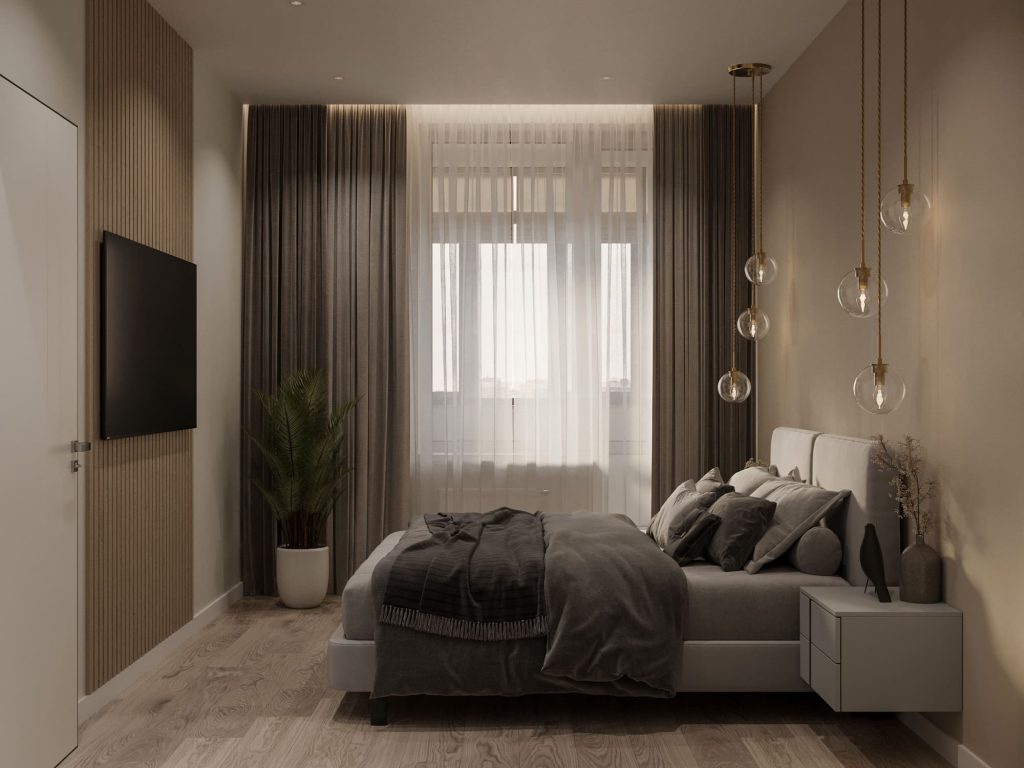 Встроенные гардеробные шкафы с гладкими фасадами и скрытыми ручками предоставляют достаточно места для хранения, поддерживая порядок в комнате. На лоджии мы организовали компактный кабинет — идеальное место для утреннего кофе с ноутбуком или чтения книги с видом на город. Большие окна с лёгкими шторами наполняют пространство естественным светом, а растения оживляют интерьер.