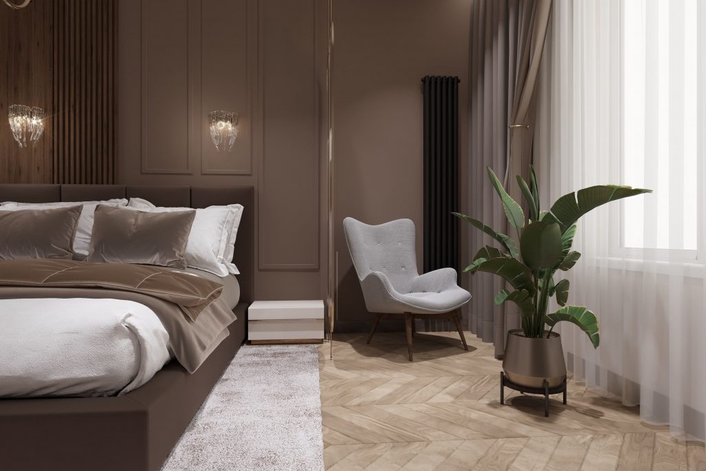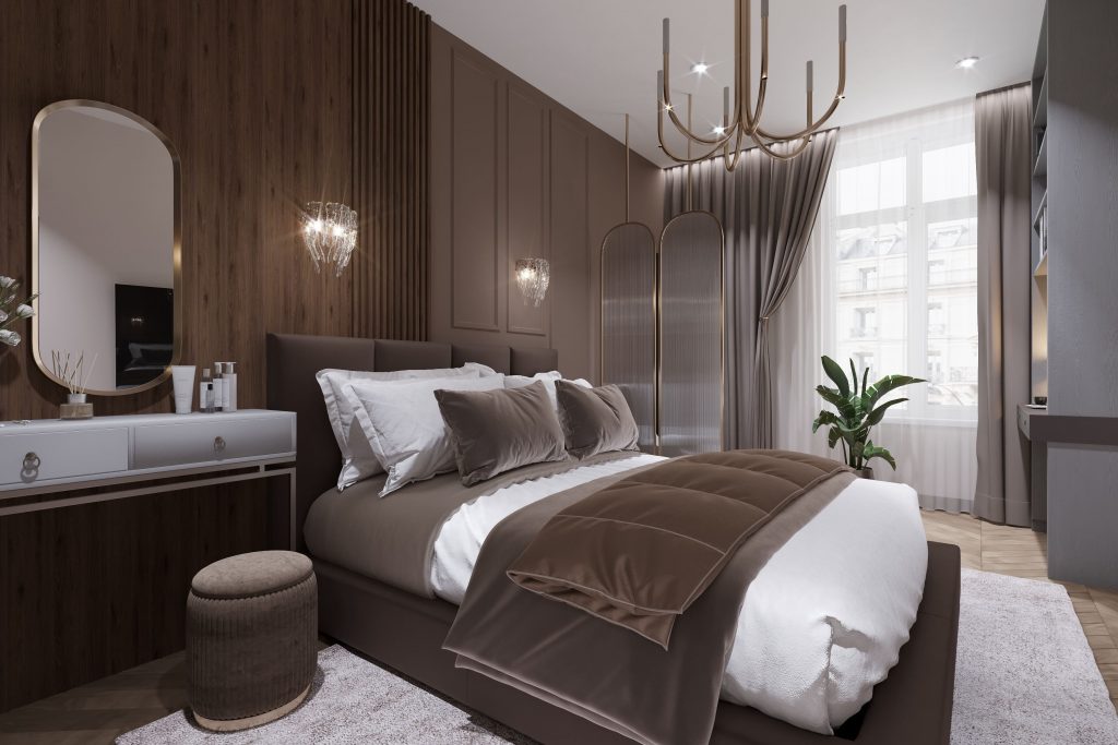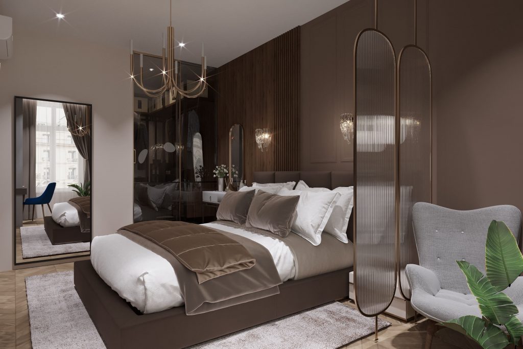 Заказчица выразила желание иметь спальню, где каждая зона четко разделена, но при этом сохраняется общая гармония пространства. Мы с особым вниманием подошли к зонированию с помощью перегородок и акцентного освещения, создавая место для отдыха, зону хранения и рабочий уголок. Такое решение позволяет наслаждаться комфортом как для сна, так и для продуктивной работы, что было особенно важно для девушки.
