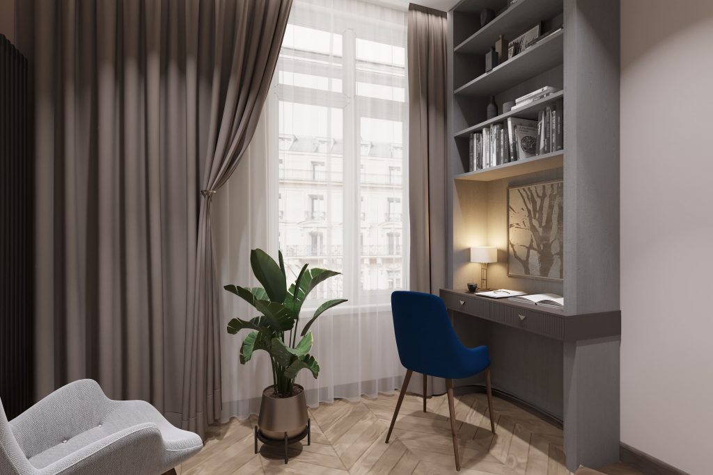 Понимая необходимость в функциональном рабочем пространстве, по запросу заказчицы мы организовали встроенный рабочий стол с полками для хранения книг и документов. Настенные шкафы с встроенными нишами и мягкой светодиодной подсветкой обеспечивают уютную атмосферу для работы и чтения. Мы стремились сделать рабочий уголок не только практичным, но и гармонично вписывающимся в общую концепцию спальни, чтобы он не нарушал атмосферу отдыха.