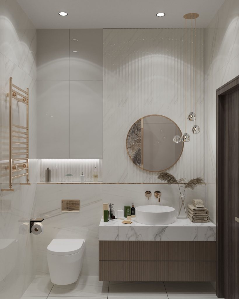 Особое внимание мы уделили зоне над инсталляцией. Встроенные решения для хранения позволили рационально задействовать «мертвую» зону для полок или шкафчиков, и обеспечить легкий доступ к косметике и мелким предметам. Это не только функционально, но и придает интерьеру завершенный и аккуратный вид, а встроенная подсветка с температурой свечения около 3000K обеспечивает мягкий рассеянный свет, создавая ощущение легкости и визуальной чистоты.