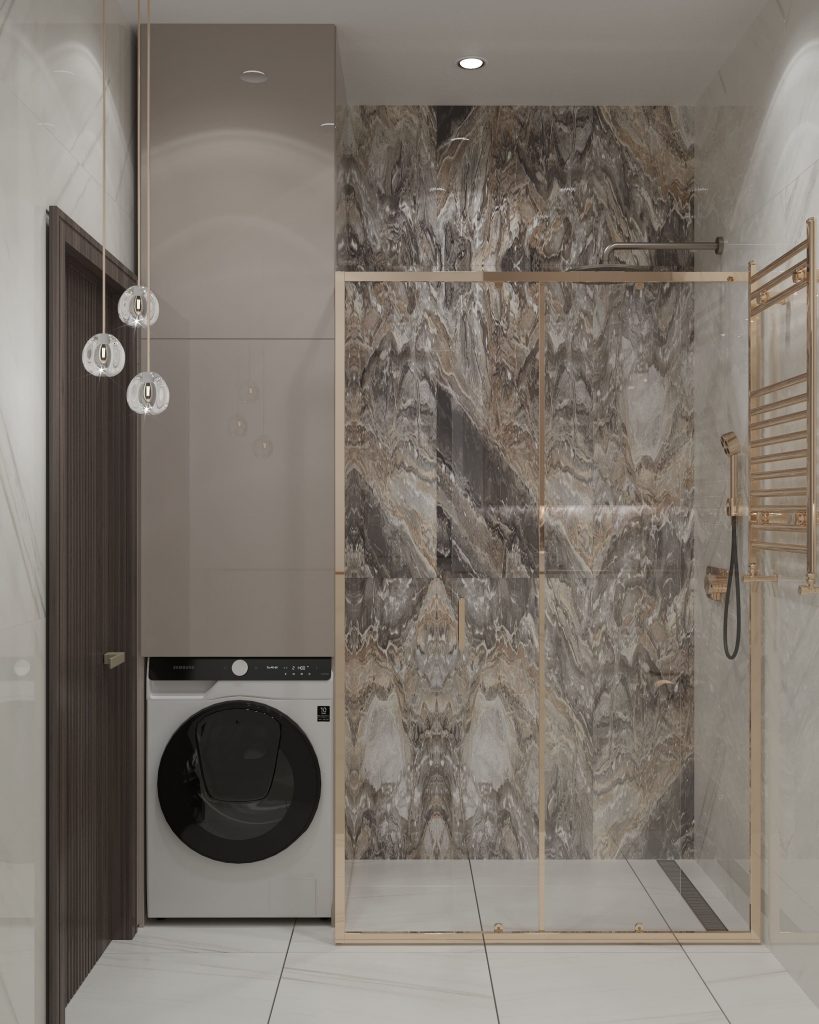 Душевая кабина стала истинной жемчужиной санузла. Мы отделали ее керамогранитом с богатой мраморной текстурой, добавляющей нотки роскоши и стиля. Безрамная стеклянная перегородка с антибактериальным покрытием обеспечивает максимальную прозрачность и легкость ухода. Встроенные ниши для хранения с подсветкой позволяют удобно разместить все необходимые аксессуары для душа, а линейный трап обеспечивает эффективный водоотвод, поддерживая эстетичный вид пола.