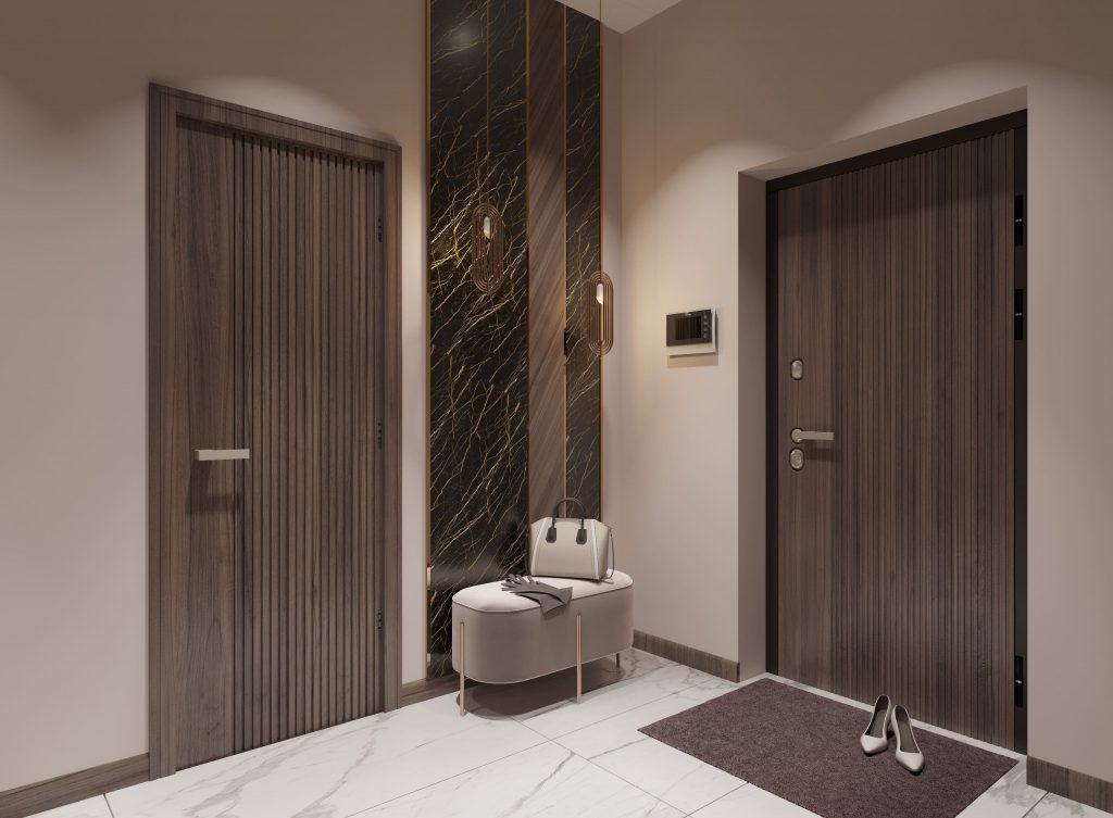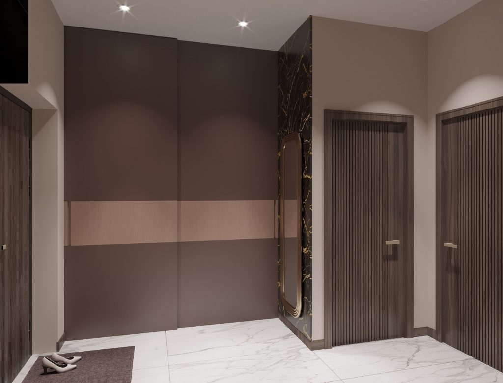 По просьбе заказчиков, мы минимизировали элементы декора, чтобы оставить больше пространства для свободного перемещения. Мягкий пуф у двери добавляет нотку уюта и позволяет с комфортом присесть при снятии обуви — мелочь, которая делает ежедневную рутину приятнее. Точечное освещение на потолке создает рассеянный свет, подчеркивая текстуру отделки стен и пола. Без внимания не оставили и ширину основного прохода: соблюдая стандарты эргономики, мы обеспечили не менее 100 см для свободного передвижения, что особенно важно в часы, когда семья заказчицы заезжает к ней в гости.