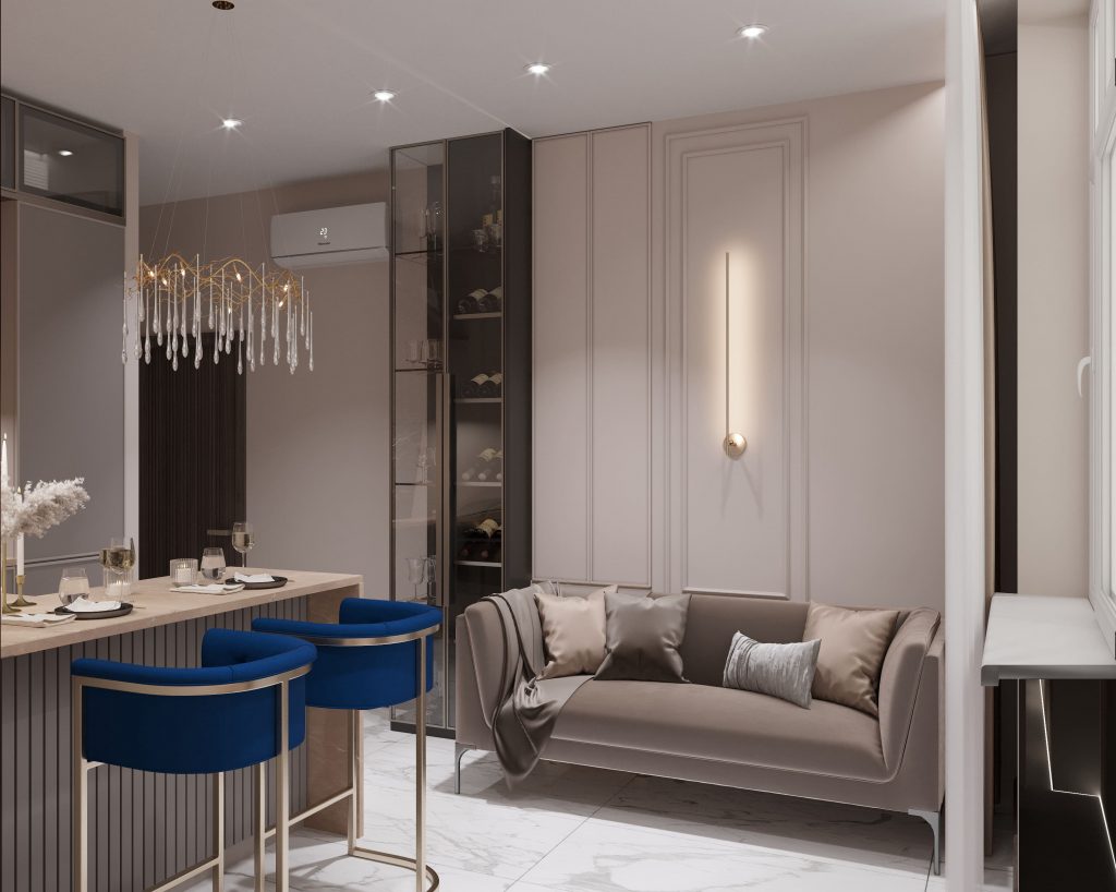 Декоративная подсветка в виде бра на стене и встроенные светильники на потолке создают акцентное освещение, подчеркивая основные зоны комнаты. Барные стулья и столовая зона были компактно вписаны в пространство, обеспечивая функциональность без ущерба для эстетики.