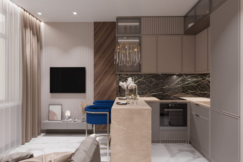 В кухонной зоне мы использовали модули, доходящие до потолка. Это решение не только оптимизирует пространство для хранения посуды и кухонной утвари, но и придает элегантный и завершенный вид. Фартук кухни выполнен из мраморной текстуры с темным камнем и золотыми прожилками, добавляя элемент роскоши и функциональности, так как легко чистится, а верхние шкафы с прозрачными фасадами добавляют воздушности.