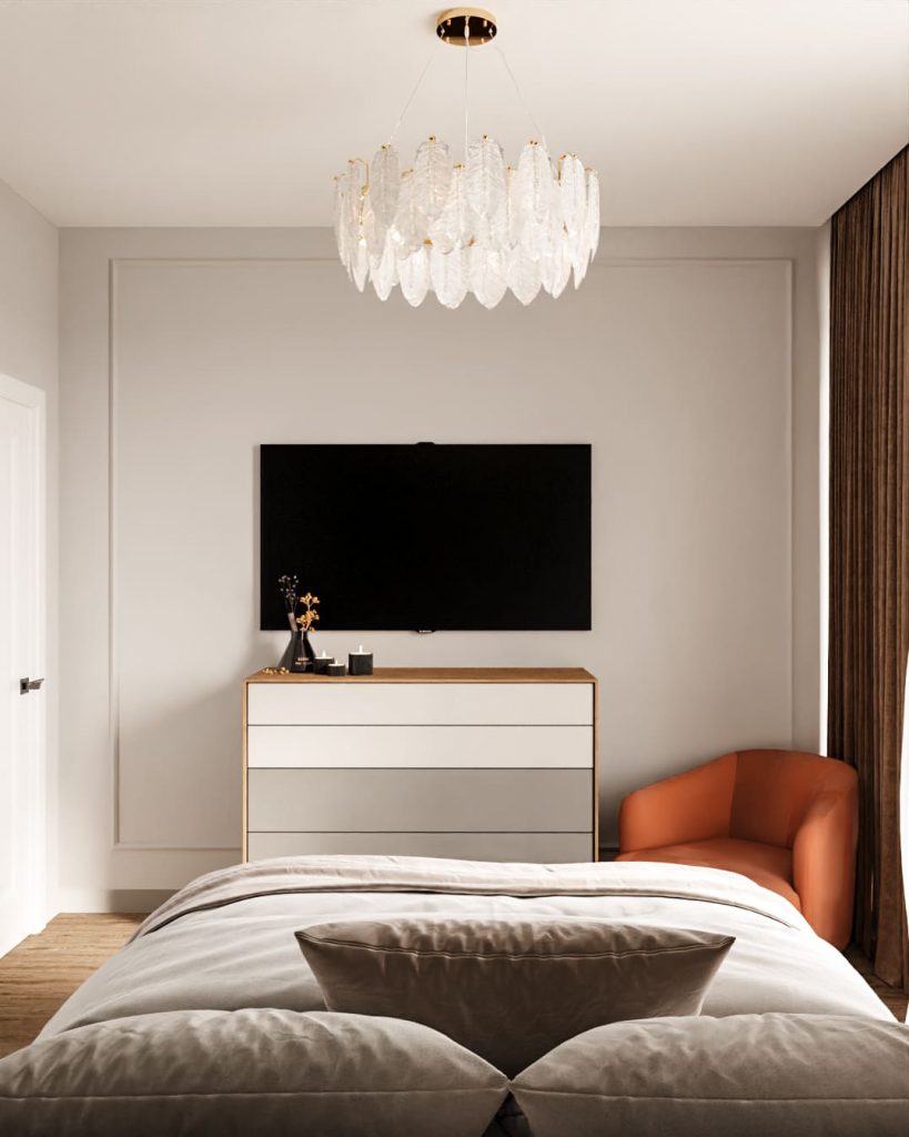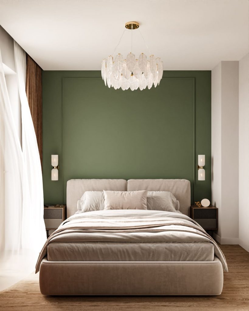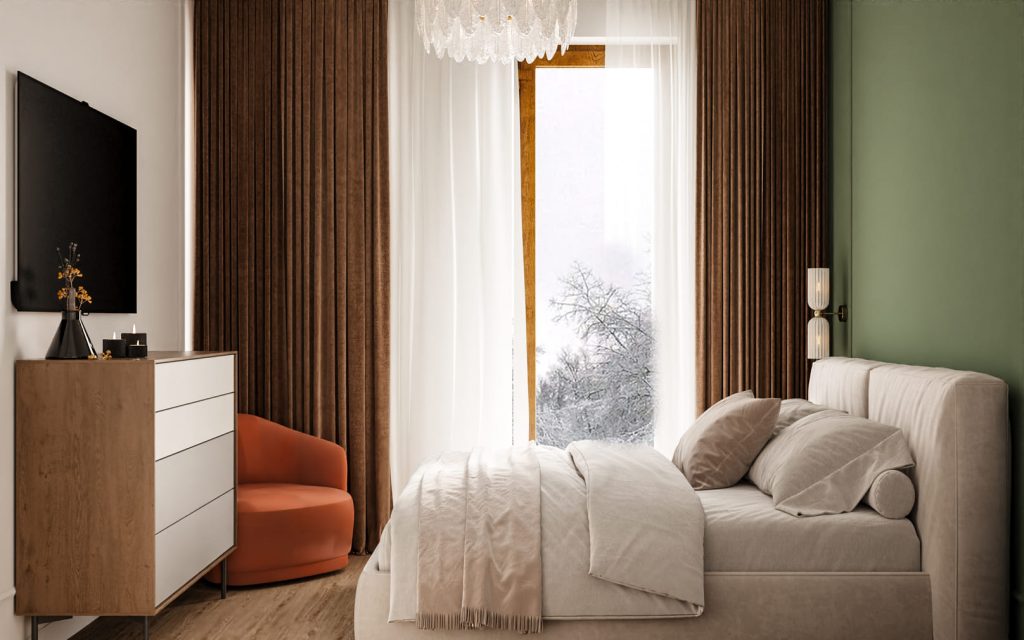 Пространство получилось тёплым, сдержанным и с лёгким дизайнерским акцентом, чтобы каждый чувствовал себя здесь спокойно и по-домашнему уютно. Глубокий зелёный цвет стены за изголовьем задаёт тон комнате и создаёт визуальный акцент без перегрузки. Светлый текстиль на кровати, мягкая обивка и тёплое освещение делают интерьер расслабляющим и ненавязчивым. У окна — лёгкие белые шторы в сочетании с плотными коричневыми портьерами, которые при необходимости обеспечат приватность и уют в любое время суток. Небольшое кресло тёплого терракотового оттенка добавляет цветовой акцент и создаёт уголок для отдыха или чтения.