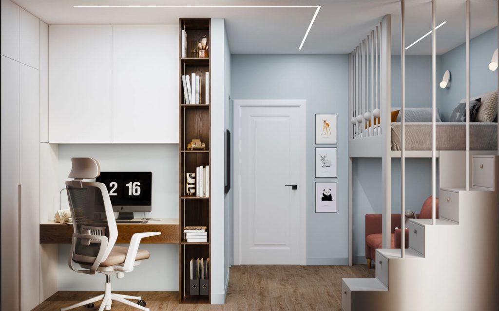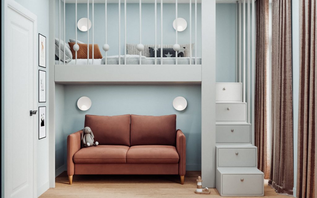 Главная особенность детской комнаты — двухуровневая конструкция с кроватью на антресоли. Внизу — мягкий диван для чтения, игр или вечернего мультика с родителями. А лестница, ведущая наверх, одновременно служит системой хранения — в каждом «шаге» спрятан ящик. Спокойные оттенки голубого создают расслабленную атмосферу, а тёплый акцент в виде дивана добавляет уюта. Сочетание светлых фасадов, дерева и мягкого текстиля делает интерьер тёплым и визуально лёгким. Рабочая зона оборудована эргономичным креслом, вместительным шкафом и полками для книг и любимых мелочей. Здесь всё под рукой — и для уроков, и для творчества.