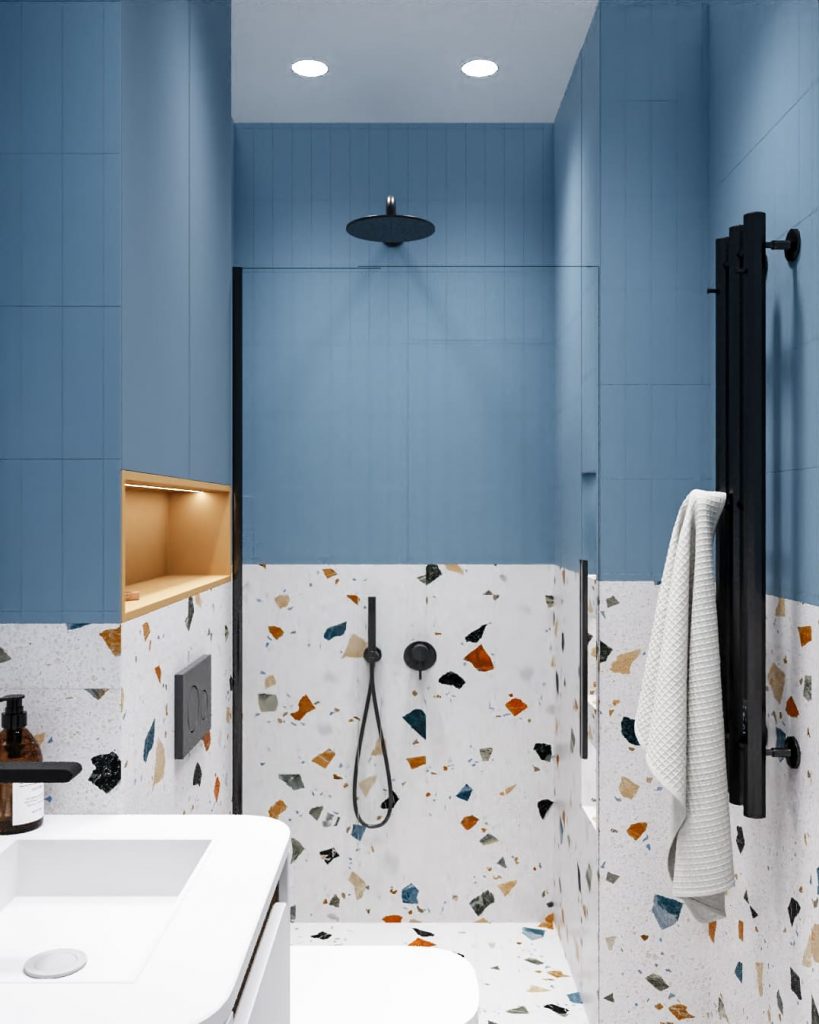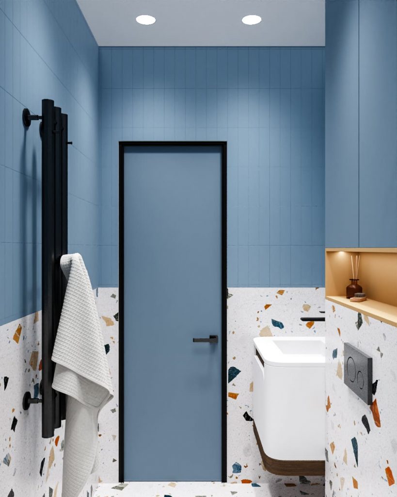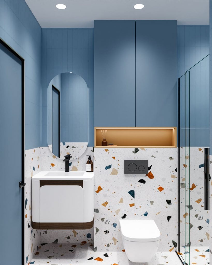 Низ стен и пола отделан плиткой с терраццо — её разноцветные вкрапления добавляют игривости, но при этом отлично маскируют следы ежедневного использования. Верх стен и дверь — в спокойном голубом цвете, который успокаивает и визуально охлаждает тёплые акценты. Ниши с подсветкой, продуманная система хранения и удобная раковина на нужной высоте — всё сделано с учётом детской самостоятельности. Чёрная фурнитура и смесители придают контраста и современности, а подвесной шкаф облегчает уборку.