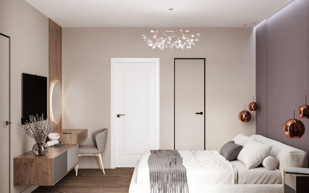 Центр композиции — мягкое изголовье кровати на фоне стены сложного лавандово-серого оттенка. Его поддерживают вертикальные рейки по бокам, визуально вытягивая пространство вверх и придавая глубину. Подвесные медные светильники по обе стороны от кровати — эффектный акцент, добавляющий тепла и уюта.