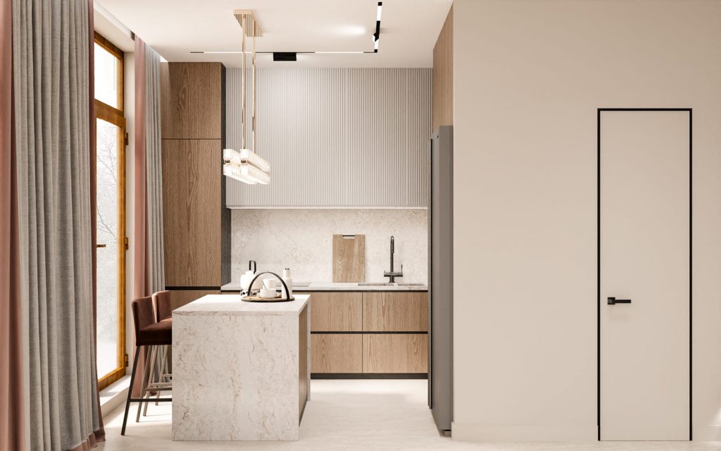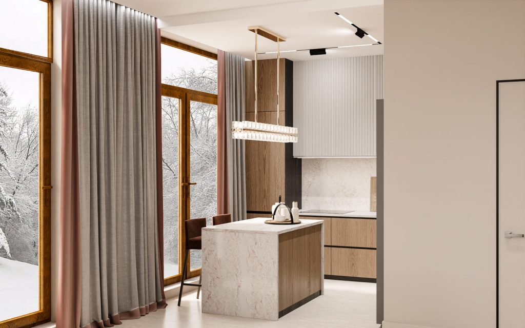 Здесь каждый метр работает на комфорт. Кухонная зона — современная, с островом и лаконичными фасадами под дерево. Встроенная техника, удобная рабочая зона, барные стулья для завтраков — всё продумано до мелочей. А текстура светлого камня в отделке фартука и острова добавляет утончённости.