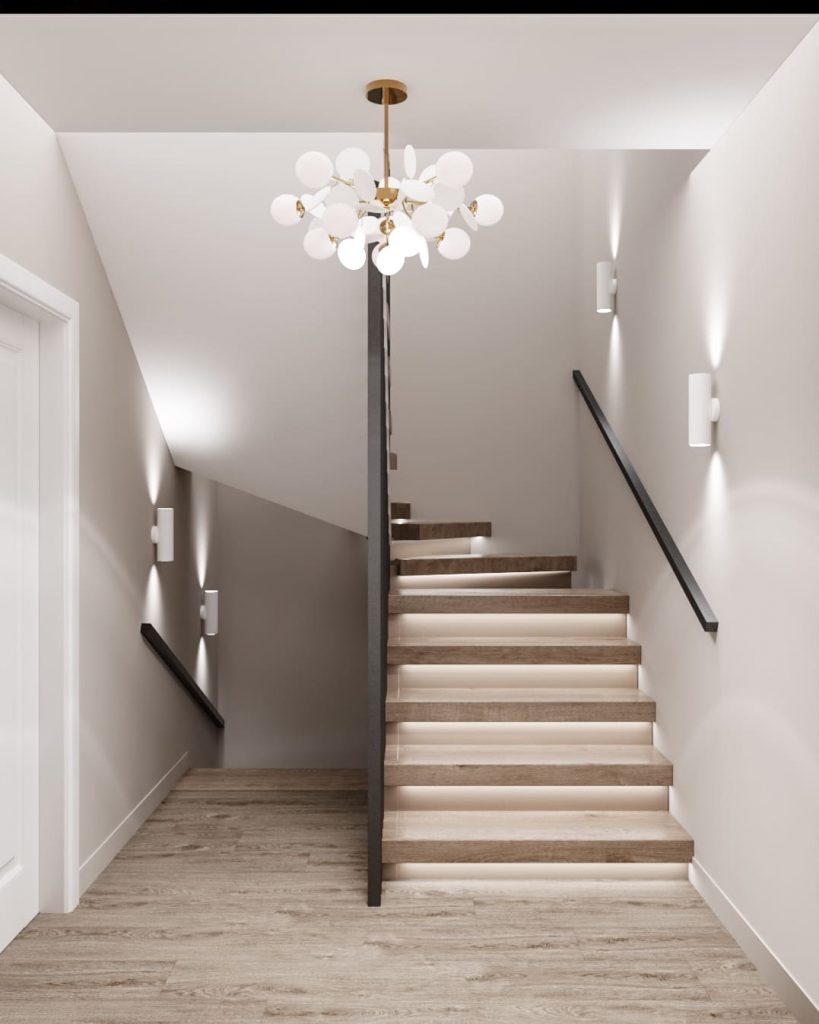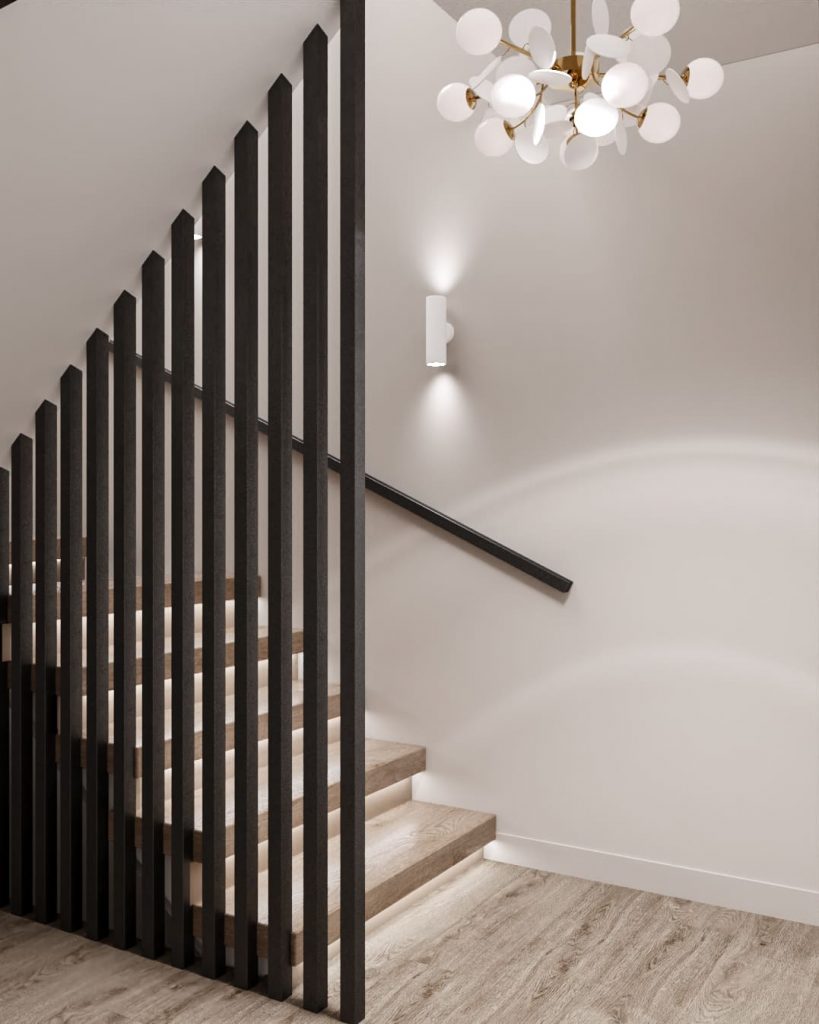 Главным элементом здесь стала лестница: деревянные ступени с мягкой подсветкой словно парят в воздухе, подчёркивая минимализм и создавая визуальную лёгкость. Чёрные перила и вертикальные перегородки добавляют чёткости и современного ритма — они не утяжеляют, но чётко зонируют пространство. Тёплое дерево на полу, спокойные оттенки стен и мягкий свет от бра создают ощущение уюта. А потолочный светильник с шариками — это тот самый акцент, который делает интерьер чуть более живым и запоминающимся.