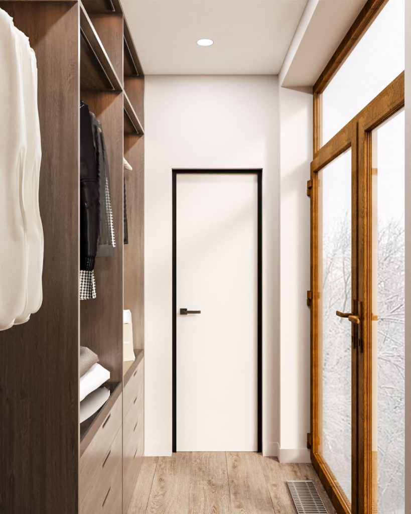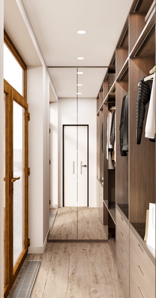 Шкафы выполнены в тёплом древесном декоре и включают в себя всё необходимое: вместительные выдвижные ящики, открытые полки для коробок и текстиля, два уровня вешалок для короткой и длинной одежды, а также ниши для обуви. Особое внимание уделено освещению: потолочные точечные светильники равномерно заливают помещение мягким светом, а большое зеркало в торце визуально расширяет пространство и делает его удобным для примерки. Дополнительный плюс — естественный свет из окна в полный рост, который делает помещение не только функциональным, но и приятным для ежедневного использования.