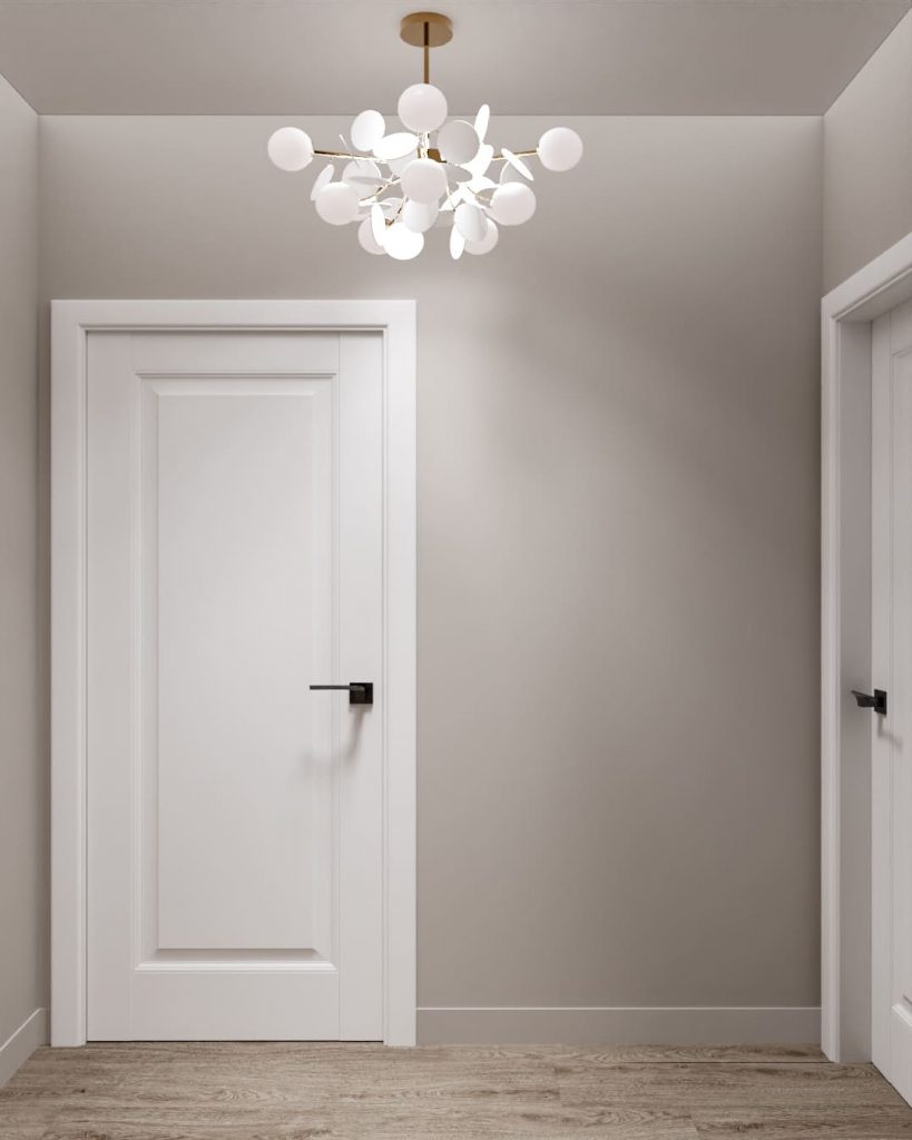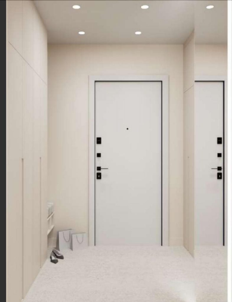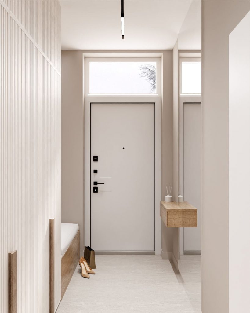 Белая дверь с лаконичной фурнитурой поддерживает современный стиль, а подвесная консоль — удобное место для мелочей и декора. Пространство получилось светлым и воздушным благодаря светлым оттенкам, зеркалу и окну над дверью.