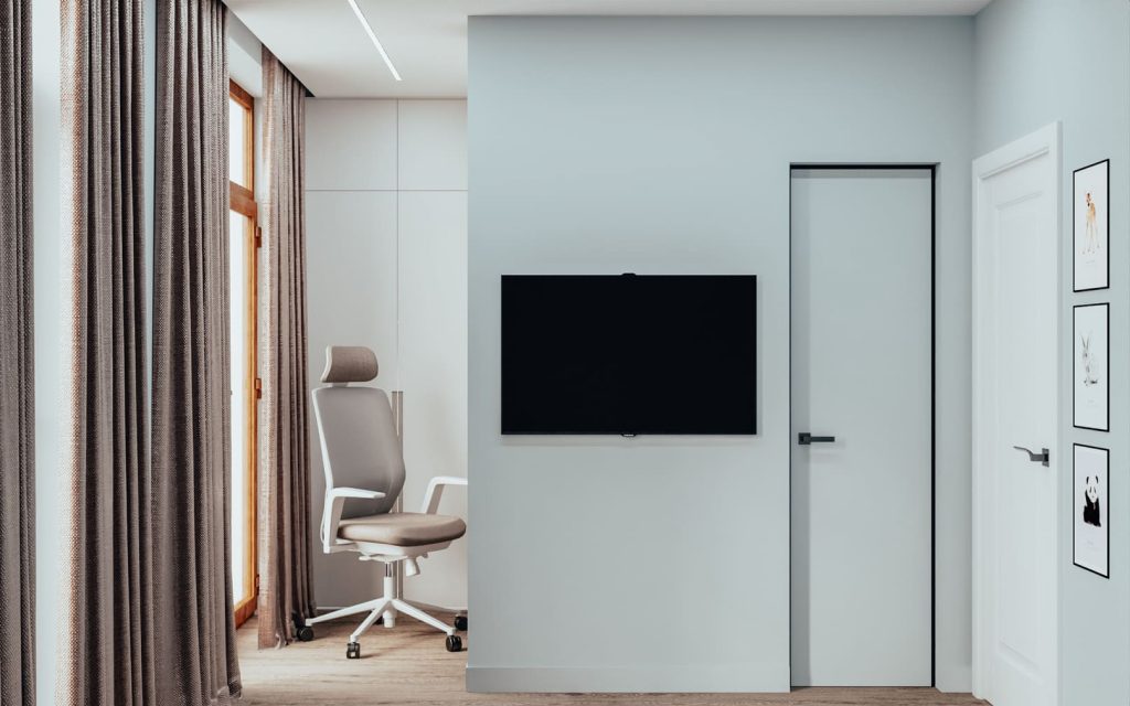 С одной стороны — полноценная рабочая зона: удобное кресло, письменный стол у окна, встроенные шкафы и стеллажи. Всё под рукой и ничего лишнего в кадре — идеальное место для продуктивной работы или учёбы.