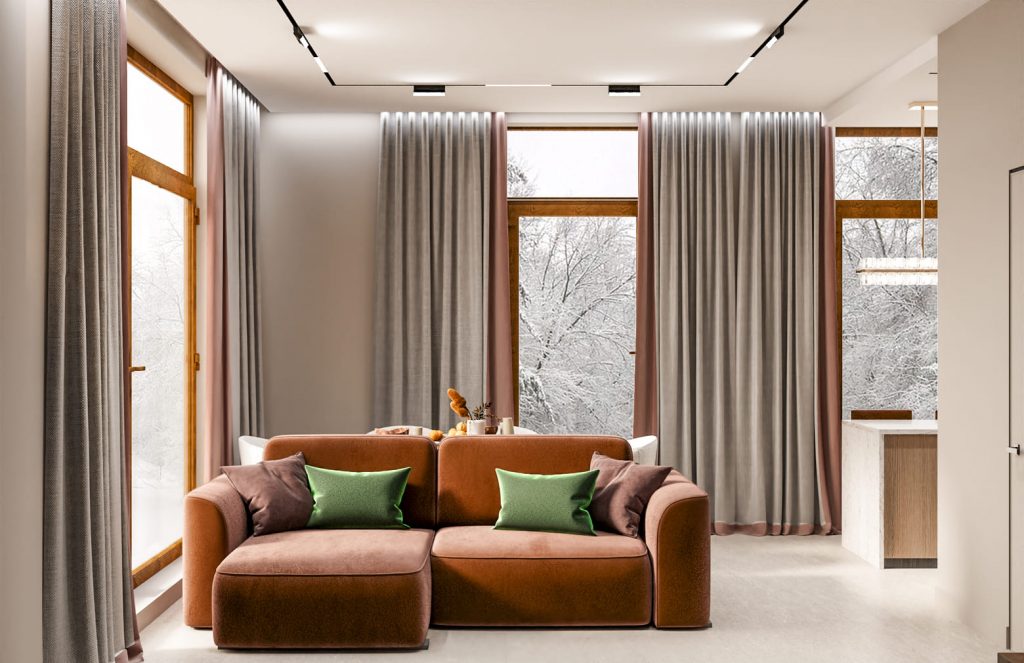 Шторы из плотной ткани с фактурной нижней частью приглушают свет, но при этом не утяжеляют интерьер. Всё здесь направлено на ощущение защищённости и тишины.