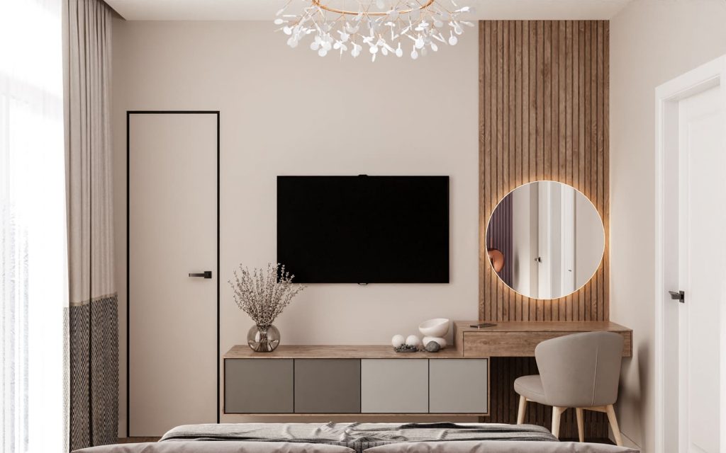У изножья — функциональная зона с туалетным столиком и ТВ-зоной. Круглое зеркало с подсветкой, рифлёная деревянная панель, тёплые материалы и матовые фасады — всё это делает утренние и вечерние ритуалы особенно комфортными.