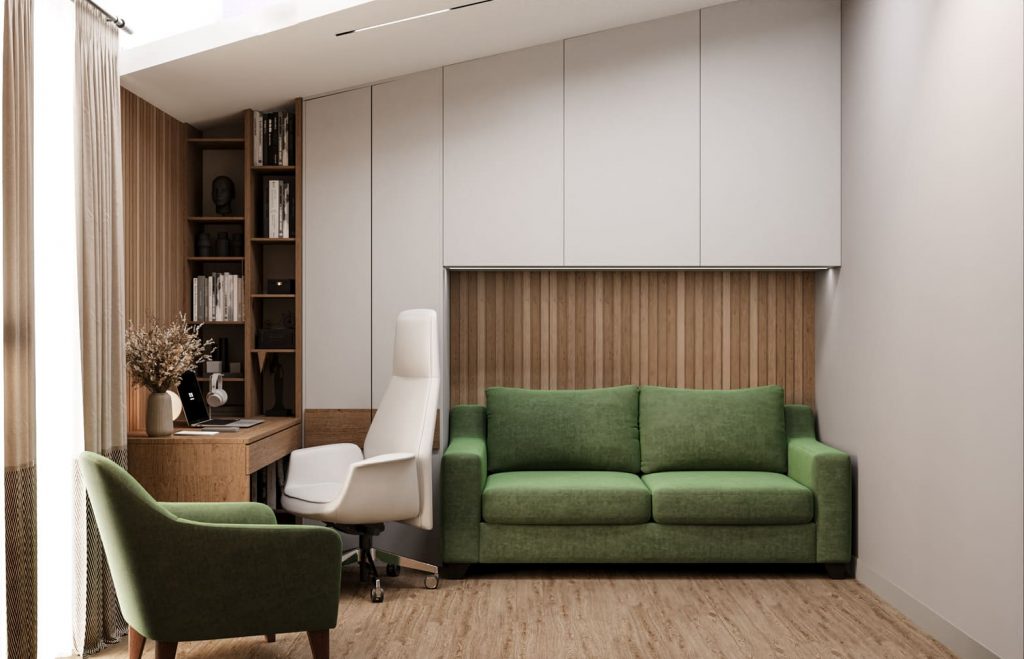 С другой — зона отдыха с мягким зелёным диваном и креслом, которая при необходимости может использоваться как дополнительное спальное место. Проектор и экран — идеальное решение для вечернего семейного кино.