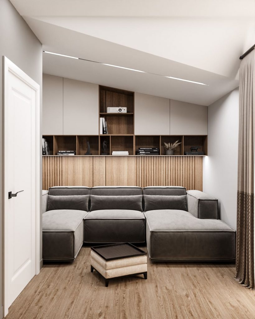Это помещение — один из самых гибких элементов проекта. Комната задумывалась как универсальная: здесь можно работать, отдыхать, устраивать вечерний киносеанс или игровую зону для всей семьи. И всё это — в одном пространстве.
