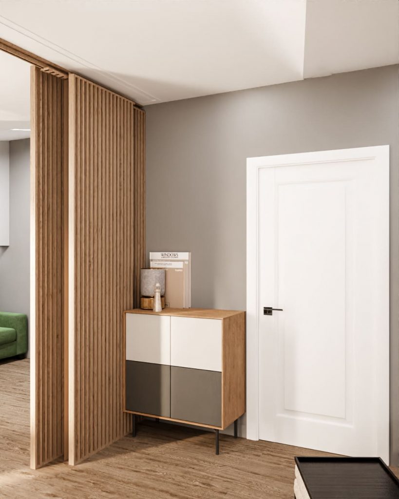 В прихожей высокие шкафы с рифлёными фасадами аккуратно скрывают одежду и обувь, создавая визуальный порядок. Мягкая скамья с ящиками — идеальна для переобувания, особенно когда на руках ребёнок или сумки. Тёплые деревянные рейки добавляют текстуру и уют.