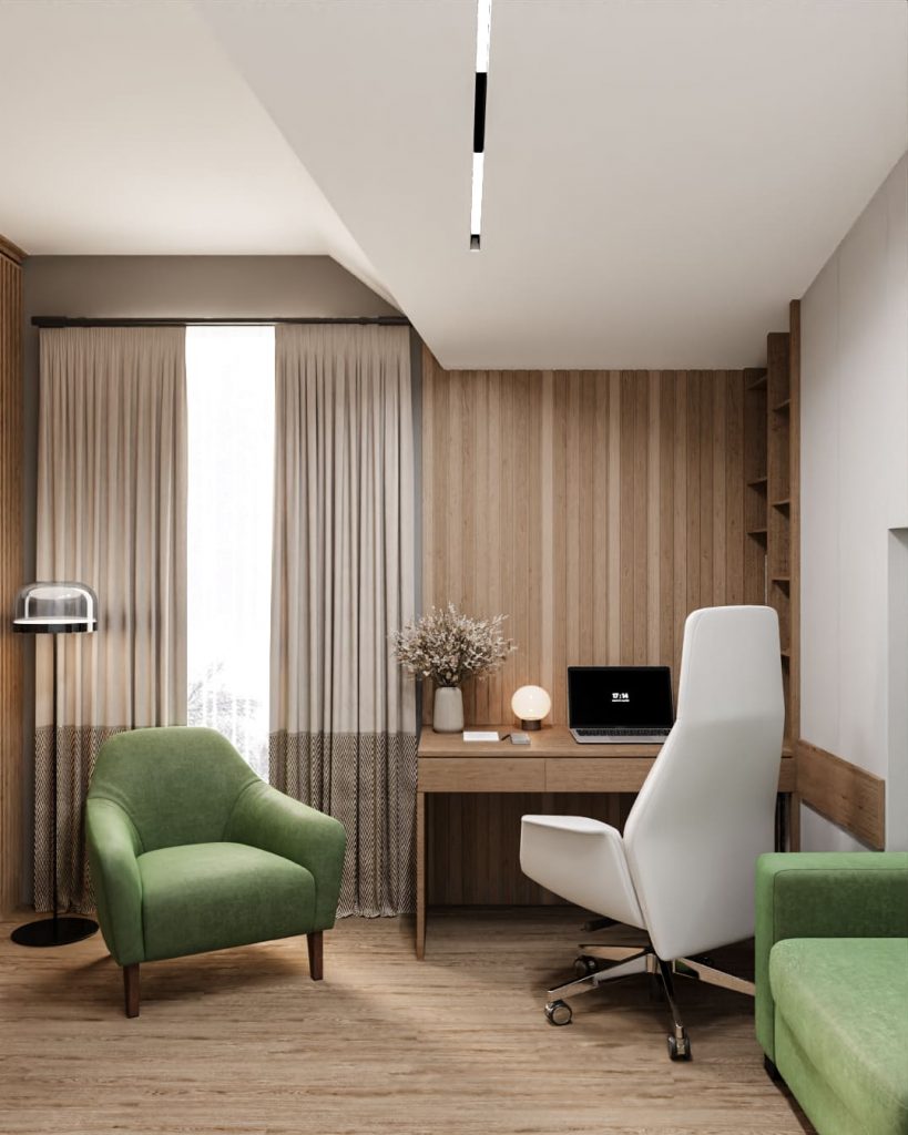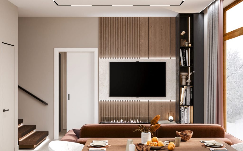 Проект двухэтажного таунхауса для семьи с ребёнком выполнен в современной стилистике с акцентом на комфорт, лаконичность и тёплую атмосферу. Интерьер построен на сочетании нейтральной палитры, природных фактур и глубоких цветовых акцентов — фисташкового, терракотового, оливкового. В отделке активно используется дерево: как в напольных покрытиях, так и в декоративных элементах — рейках, панелях, нишах.