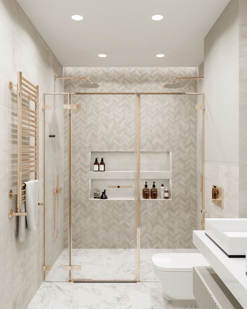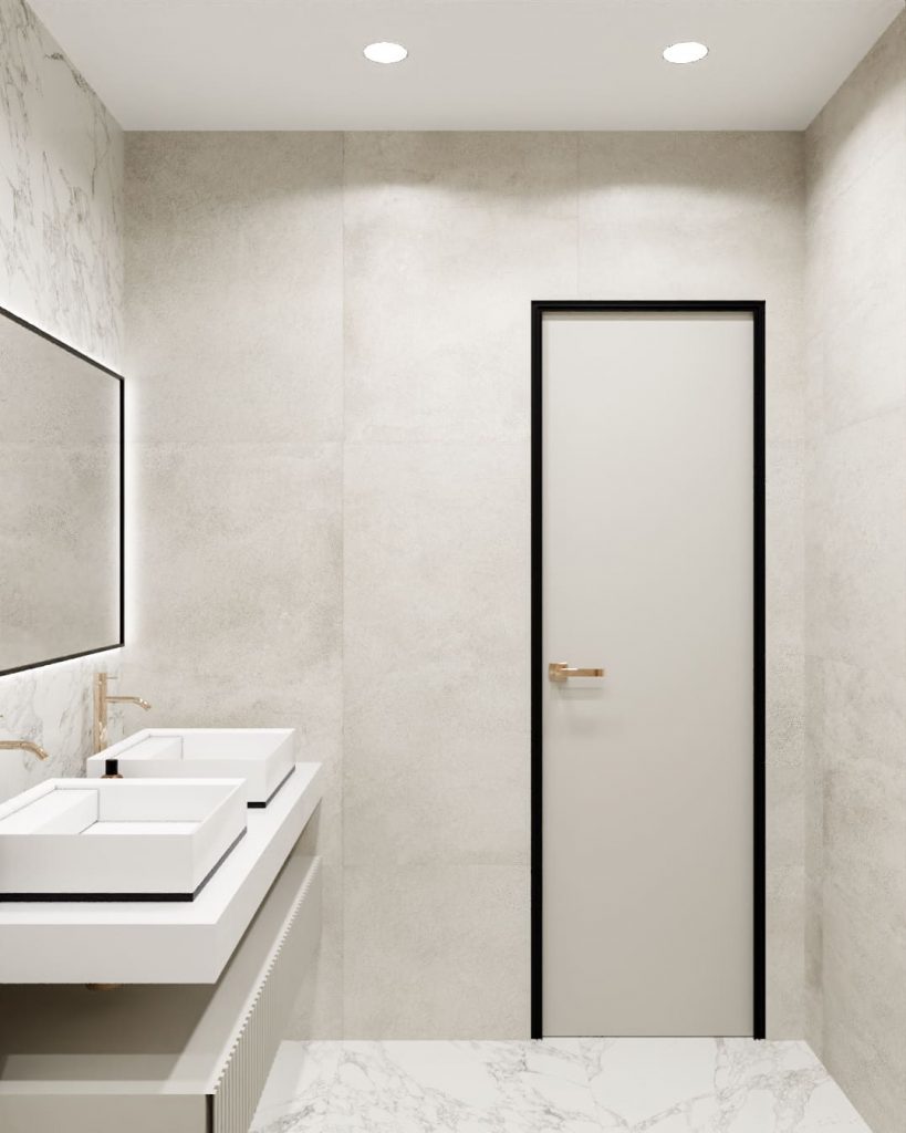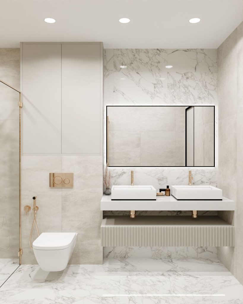 ветлая мраморная плитка, пастельные оттенки и благородная латунная фурнитура создают атмосферу приватного спа прямо у себя дома. В центре внимания — двойная раковина с прямыми линиями и подсвеченным зеркалом во всю ширину стены. Всё сделано для того, чтобы утренние сборы проходили не в спешке, а в удовольствии. Зона душа — просторная, с двумя лейками, что удобно для пары. А встроенные ниши в душевой аккуратно решают вопрос хранения без визуального шума.