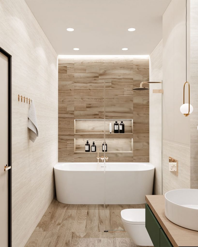 Главная изюминка — зелёная плитка “ёлочкой” за зеркалом: она добавляет глубины и настраивает на расслабление. Зеркало с подсветкой, изящные подвесные светильники и круглая раковина создают атмосферу спа, а вместительные ниши у ванны позволяют удобно разместить все необходимые средства. Зона хранения спрятана за высокими фасадами — ничего не отвлекает от эстетики. Потолочное освещение и точечные светильники дают равномерный свет, а скрытая подсветка подчёркивает текстуру стен. Пол отделан под дерево, что усиливает ощущение домашнего уюта.