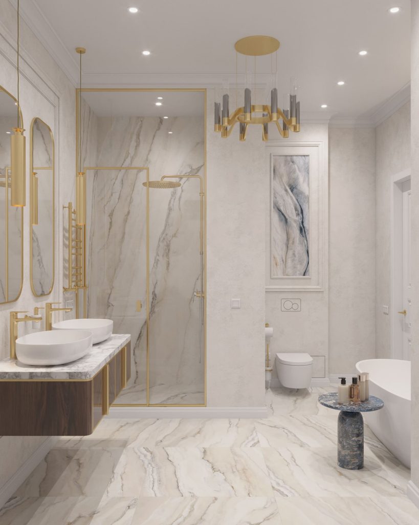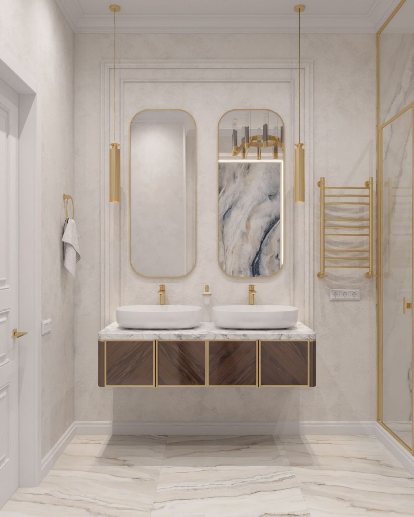 Ванная оформлена в наибольшей степени лаконично и практично - по сути, в ней места для хранения представляют собой 2 компактные тумбы с закрытыми дверцами под раковинами и небольшой оригинальный мраморный столик возле минималистичной овальной ванны. Два больших зеркала над мойками вдвойне функциональны - они создают эффект расширения пространства. А керамогранит, в котором исполнены пол и стены в душевой - самый оптимальный материал для помещения с повышенной влажностью.
