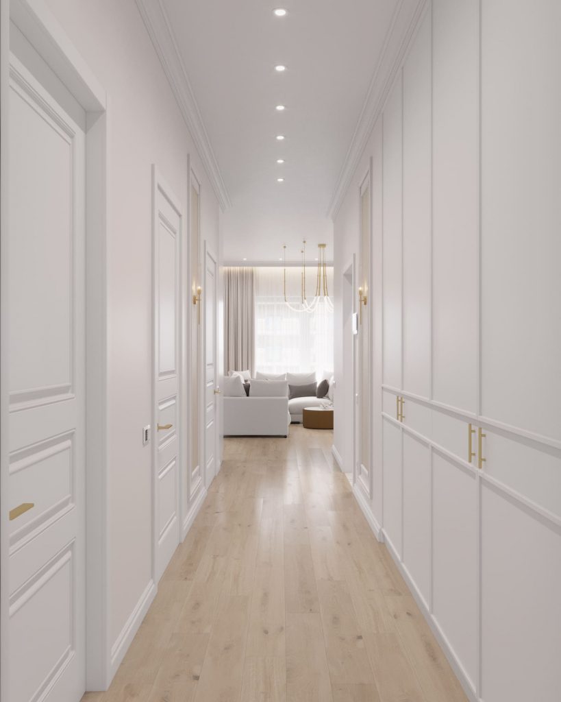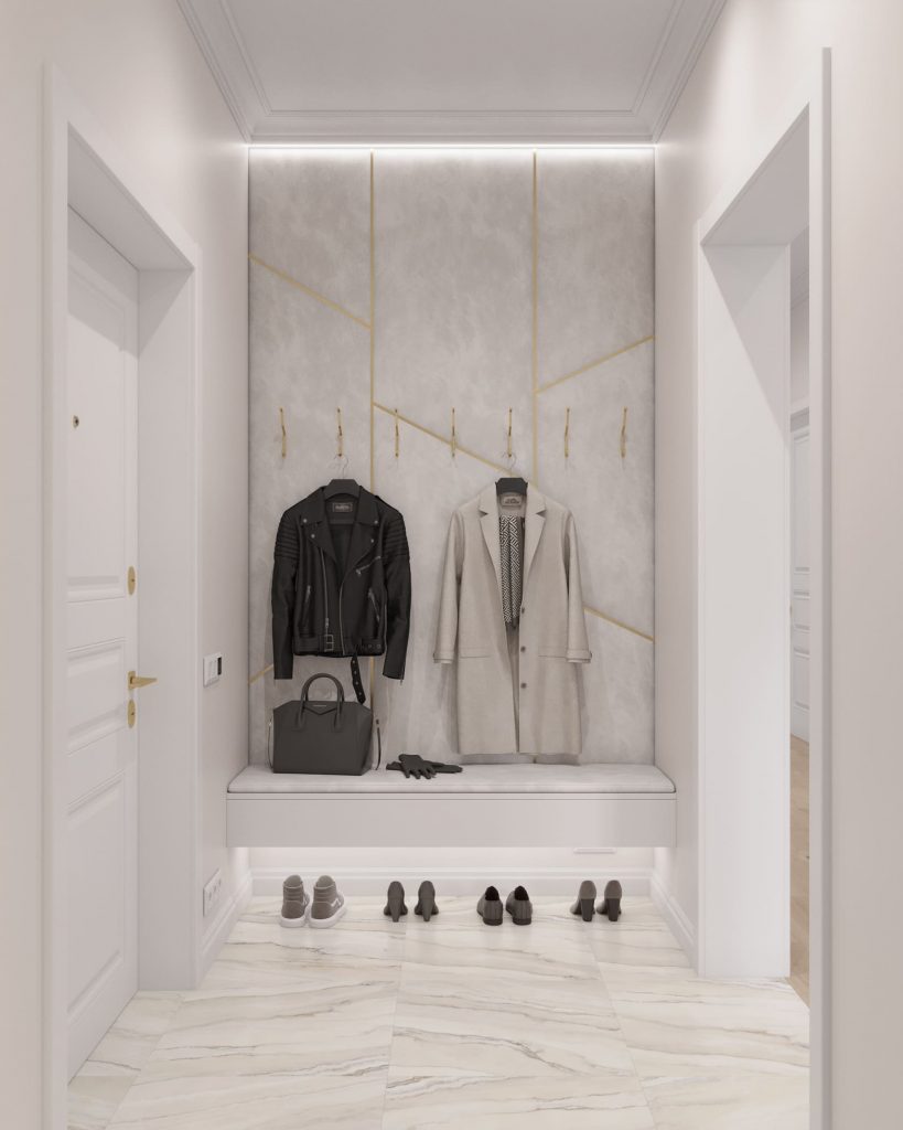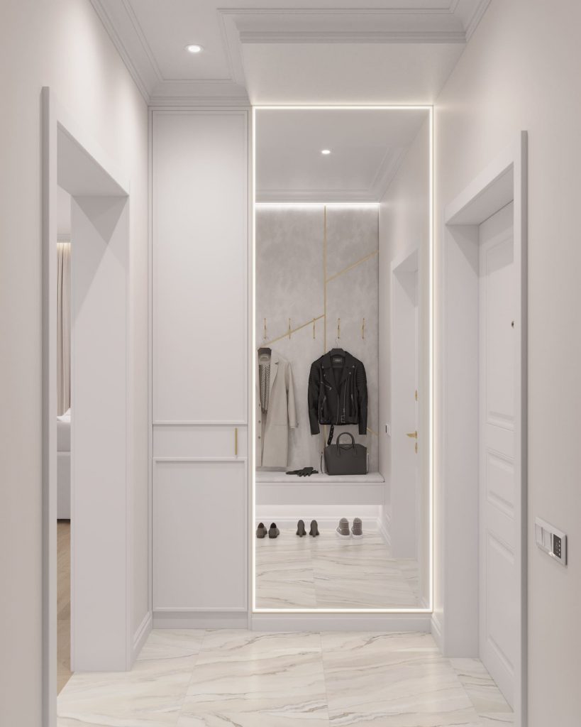При создании дизайн-проекта минималистичной квартиры для семьи из 2-х человек мы руководствовались принципами удобства, лаконичности и сдержанной эстетики. Потому, в прихожей - минимум мебели и максимум функциональности, как и хотел заказчик. Так, под вешалкой (оформленной мягкими панелями) в прихожей размещена встроенная подвесная тумба для сидения с мягкой обивкой, под которую удобно ставить обувь. А на противоположной стене помещения располагается большое зеркало от пола до потолка, создающее эффект “двойного пространства”, в которое удобно смотреться перед выходом из дома. Рядом с ним оборудован встроенный пуф, создающий эффект стены в сложенном состоянии, что отлично экономит пространство небольшого помещения. Подсветка вешалки и зеркала помогает не упустить ни одной детали, собираясь по делам.